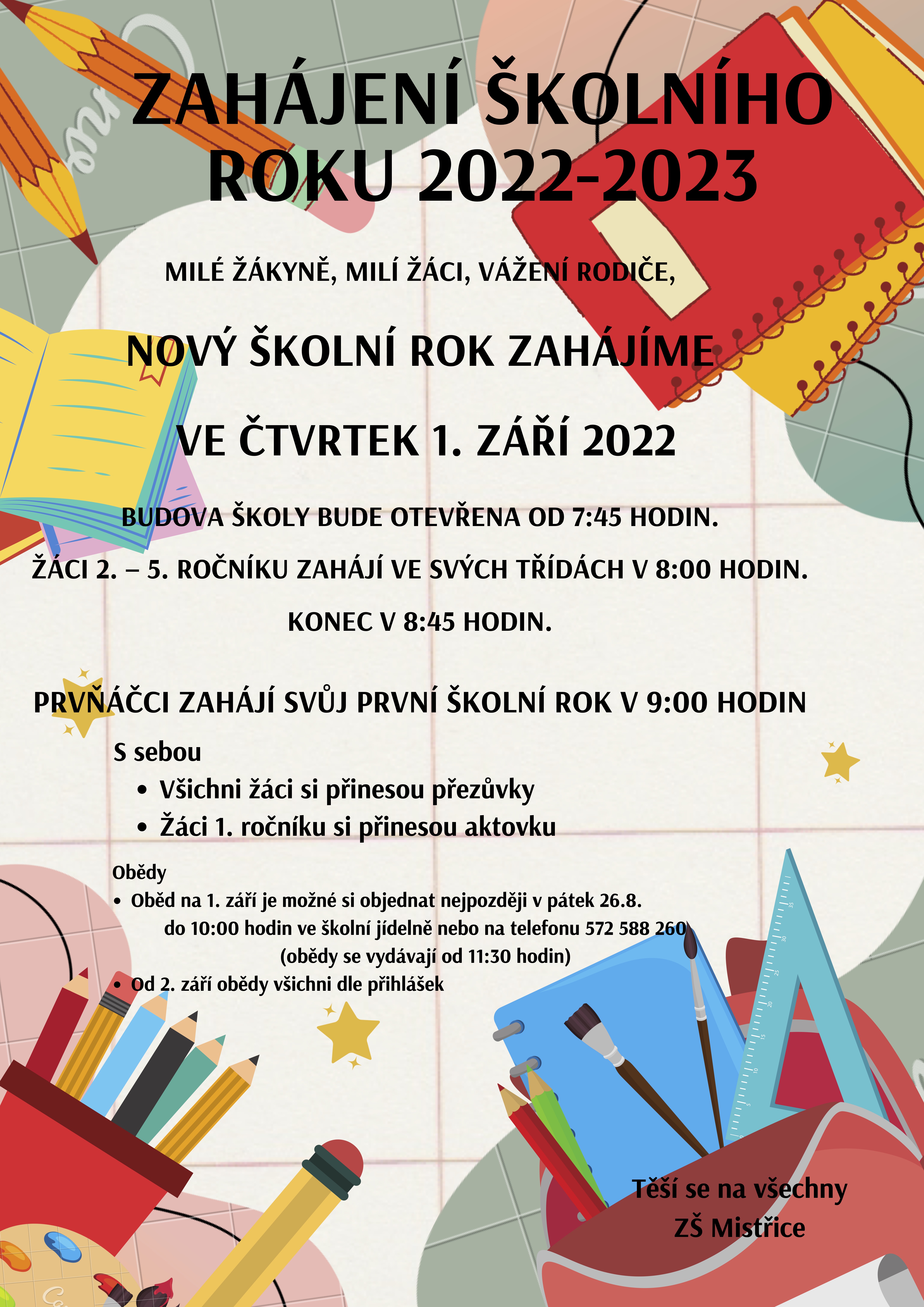 - Oběd na 1. září je možné si objednat nejpozději v pátek 26.8. do 10:00 hodin ve školní jídelně nebo na telefonu 572 588 260 (obědy se vydávají od 11:30 hodin)