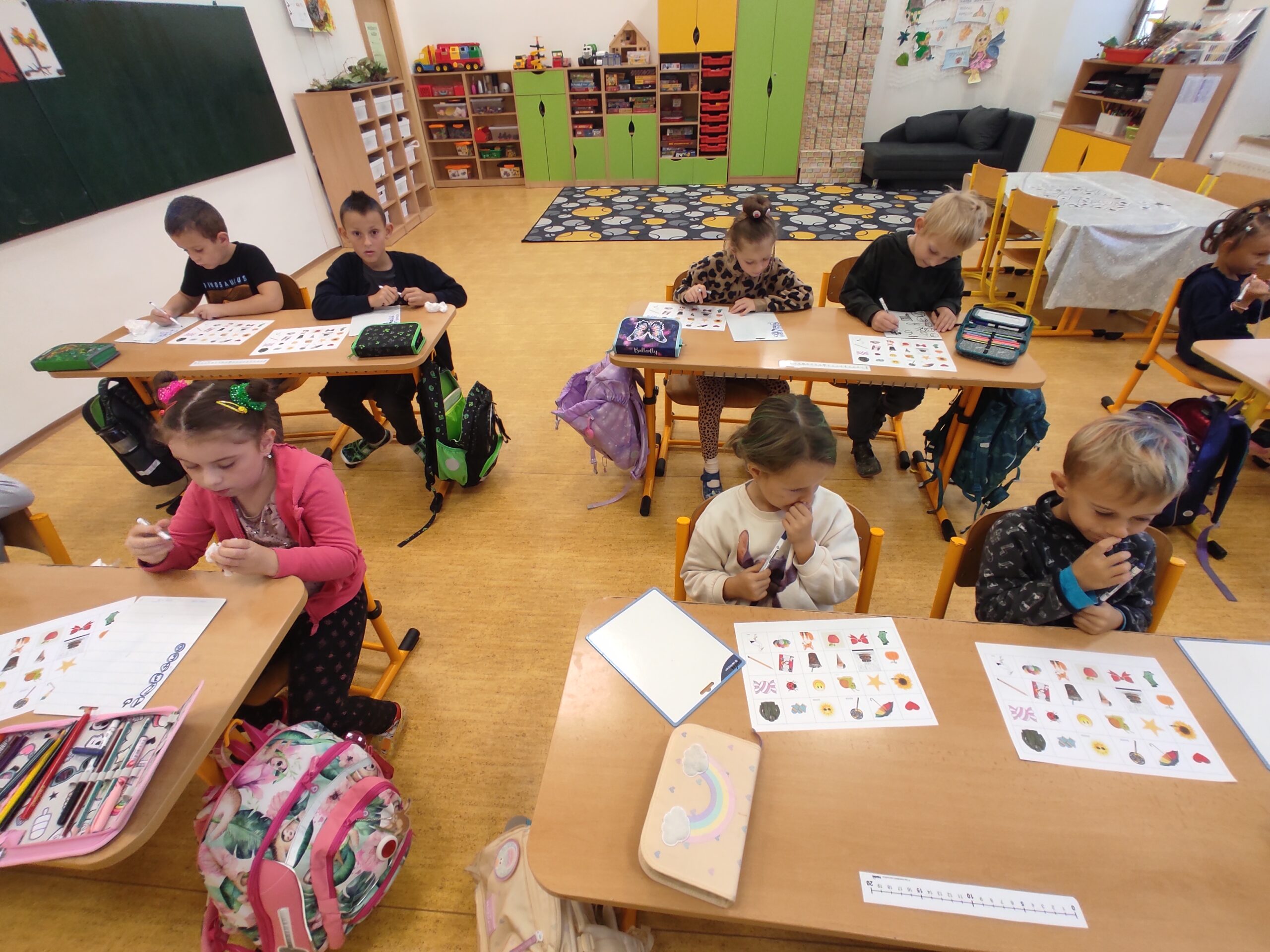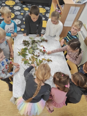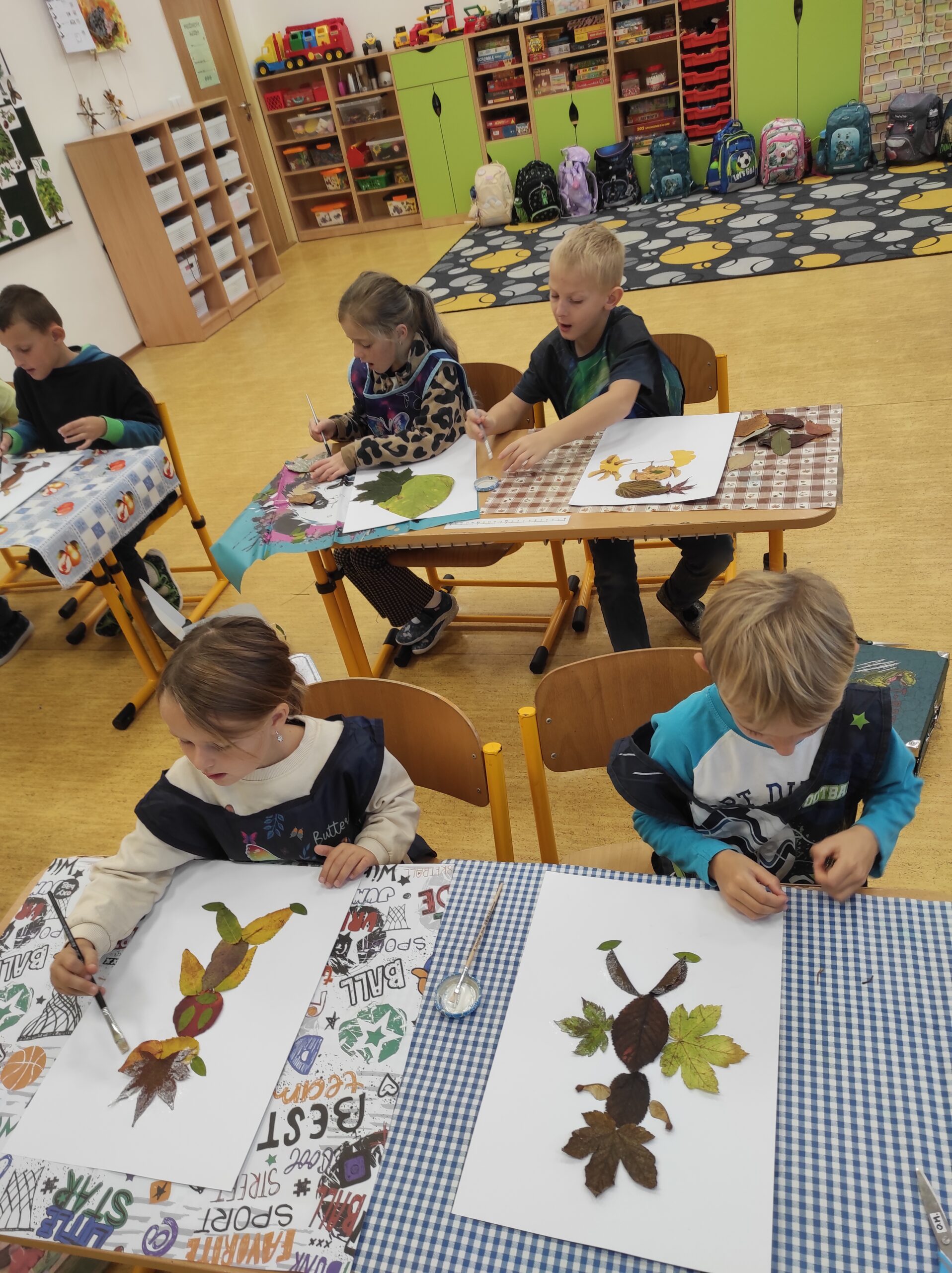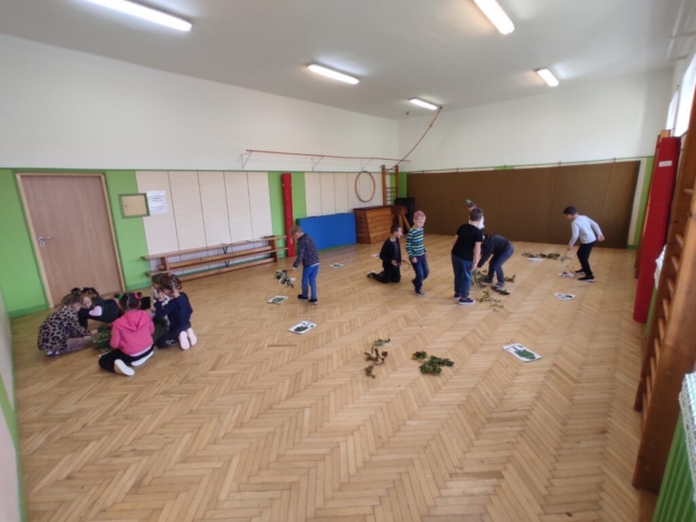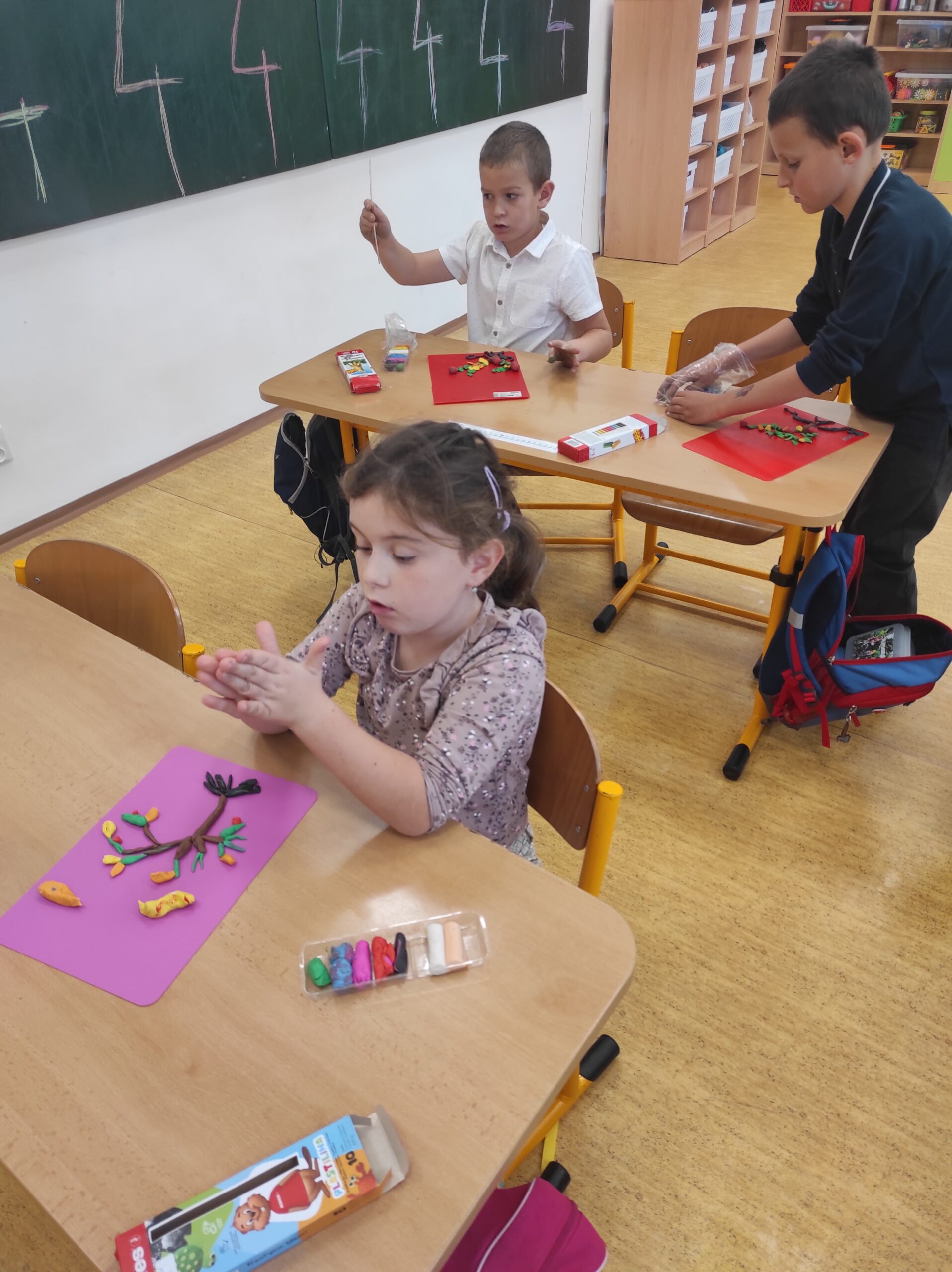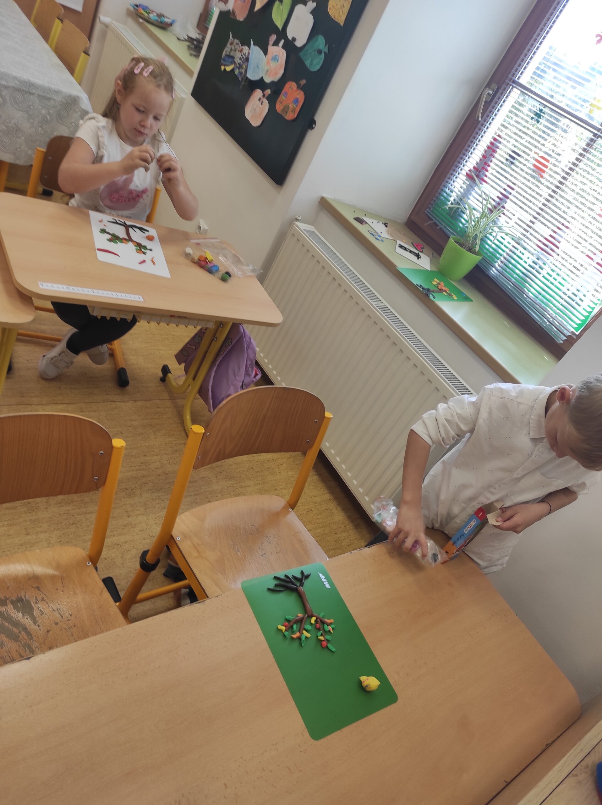 Pro zpestření výuky jsme si ve třídě připravili sběr přírodnin – listí, větvičky, šišky a plody. Děti si s nimi mohly hrát, skládat je do různých tvarů nebo je využít při tvorbě vlastních uměleckých děl. Velkým úspěchem byla modelace stromů z plastelíny. Podle diktátu jsme si vytvořili model stromu. Tato aktivita jim pomohla lépe pochopit strukturu a tvar stromů a zároveň rozvíjela jejich jemnou motoriku, prostorovou představivost a pravolevou orientaci. Tyto dovednosti jsme ještě rozvíjeli při hře šipkovaná a skládání obrázků z geometrických tvarů.