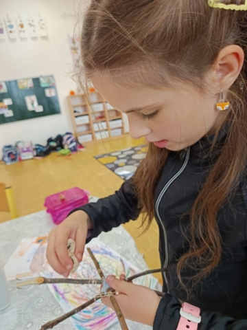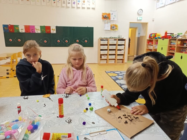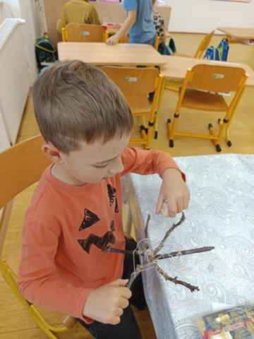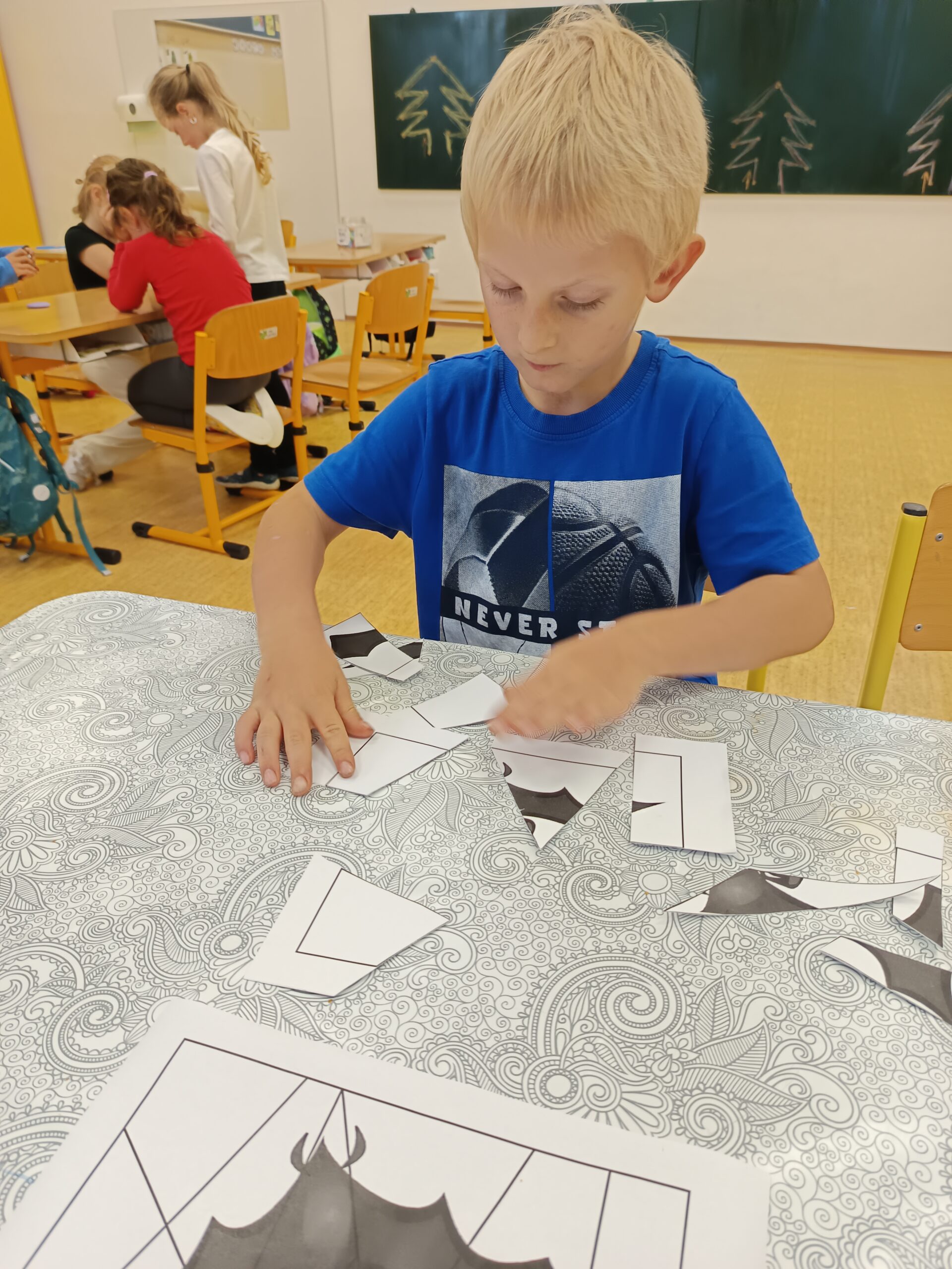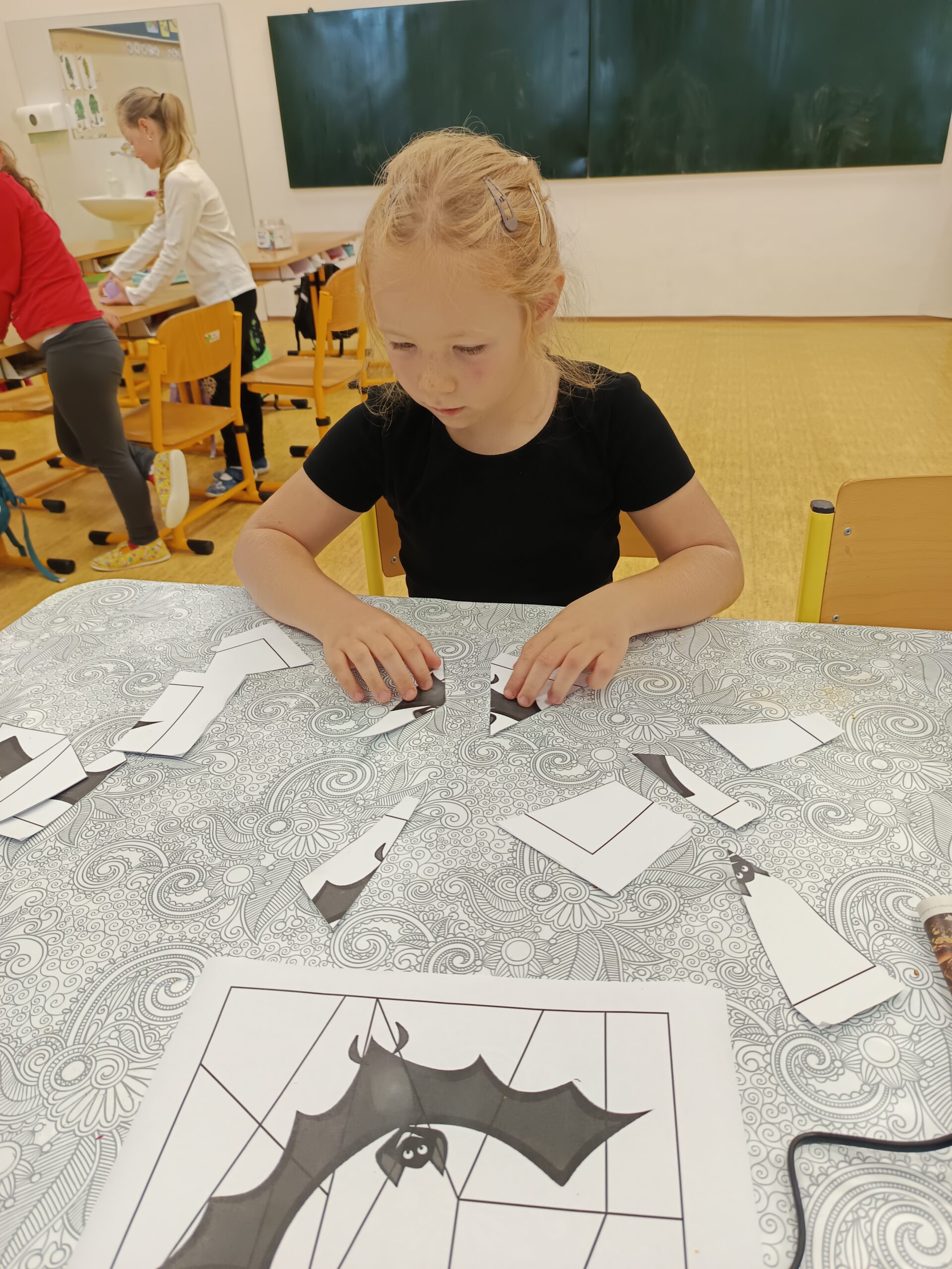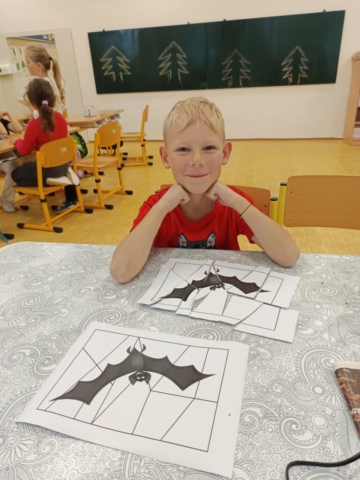 V naší družině jsme si v říjnu užili spoustu zábavy s podzimní i halloweenskou tematikou. Děti se zapojily do tvoření s názvem Kdo bydlí v dýni, kde vznikaly veselé i strašidelné dýňové domečky pro skřítky, myšky i pavoučky. Do obří dýně se nám dokonce nastěhovali červi. Nechyběly ani halloweenské omalovánky, obří dýňové bludiště, strašidelný závěs a duchové na výzdobu tělocvičny na akci Veselé dýňování. Z přírodnin jsme vyráběli pavučiny z klacků a provázku, které se staly krásnou výzdobou tříd. V herní části každého týdne jsme si zasoutěžili v různých aktivitách – hod semínkem, puzzle netopýr, bingo i logická hra – Zjisti co schází.