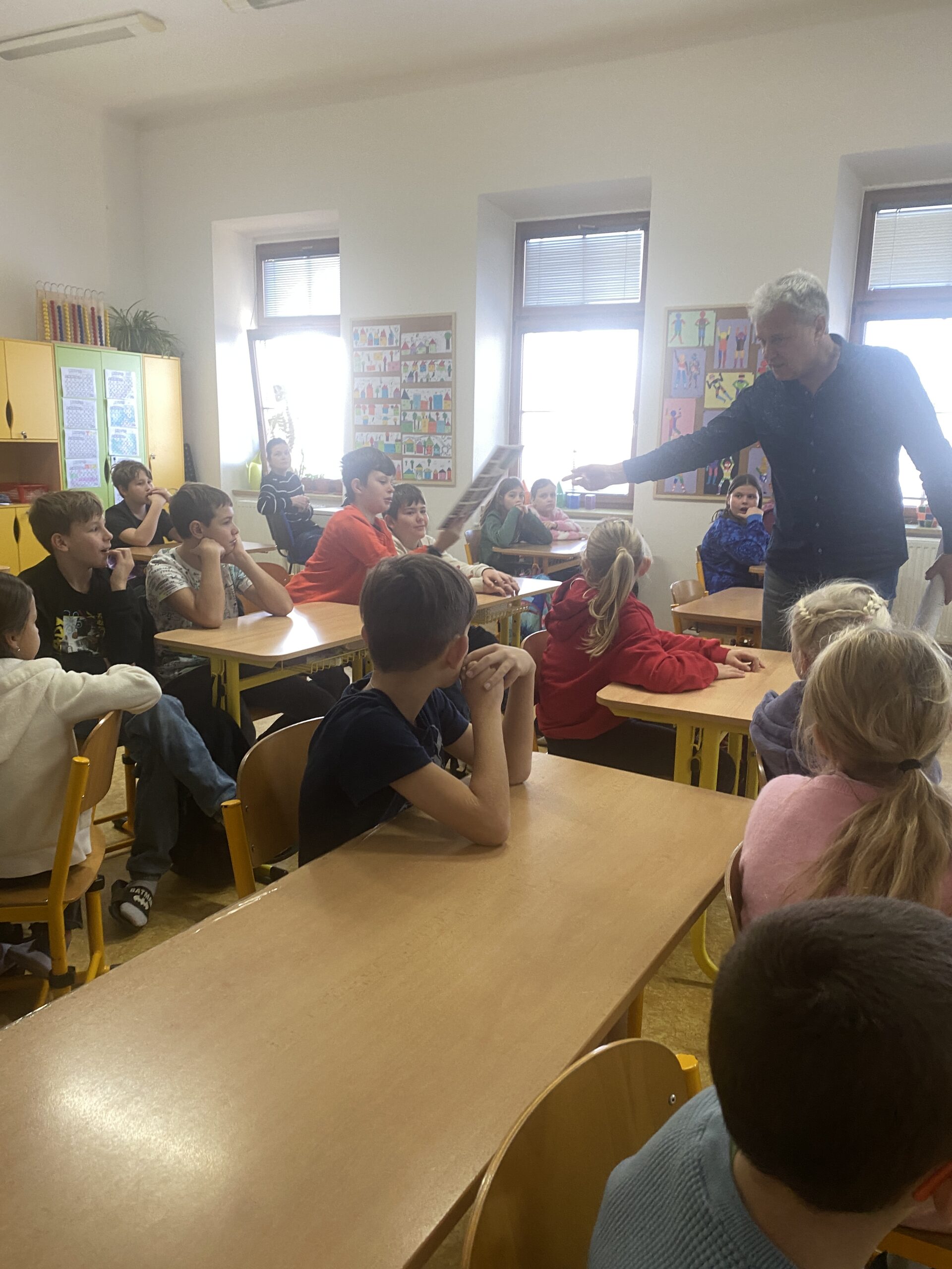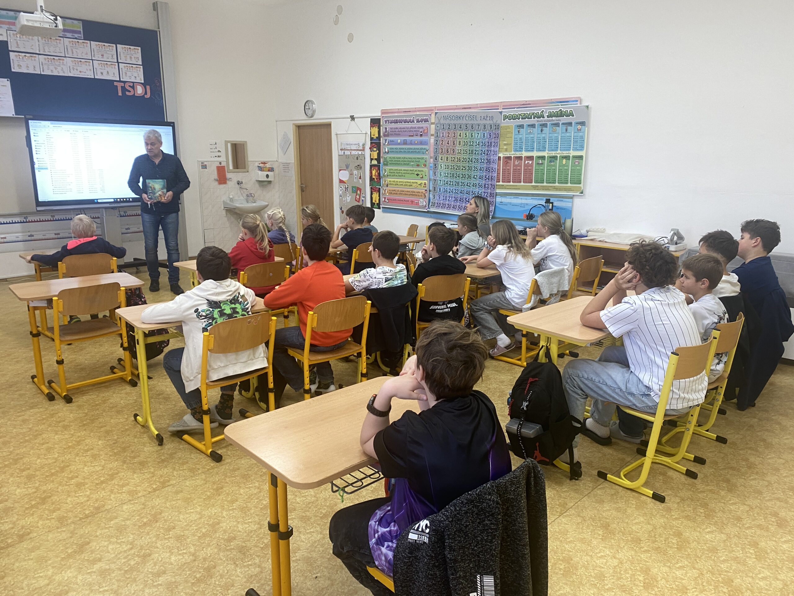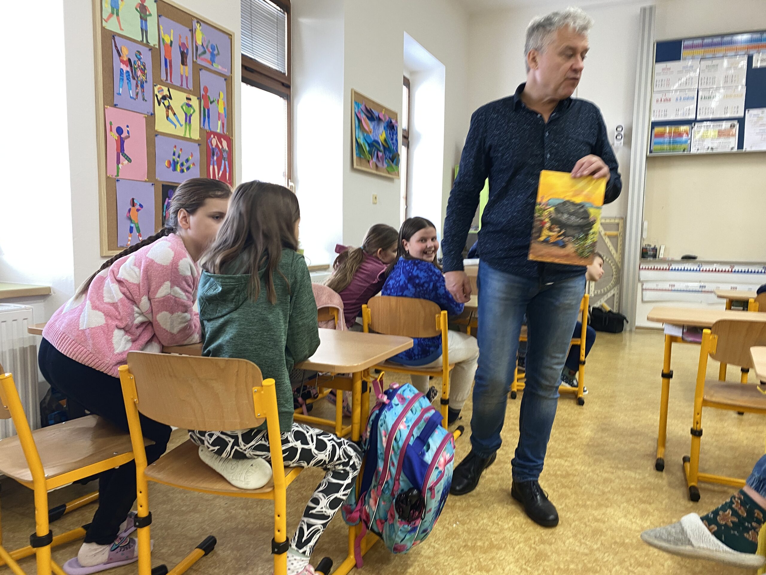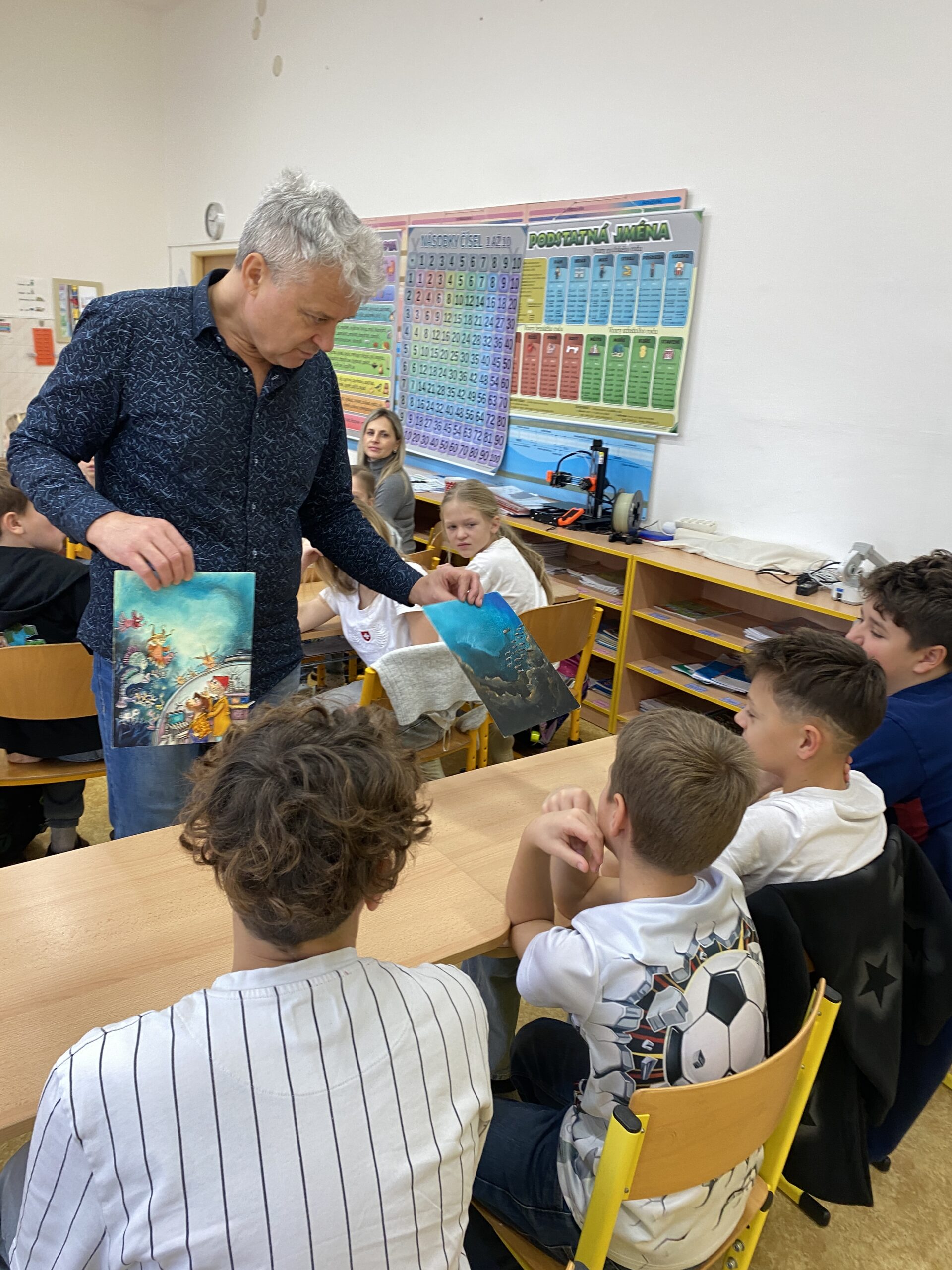 V pátek 28.11. do naší školy zavítal spisovatel Josef Beneš, který našim žákům představil svoji tvorbu. Během besedy se žáci pomocí dokumentu přenesli do tiskárny a dozvěděli se, jak taková kniha vzniká a co všechno proces výroby obnáší. Pan spisovatel žáky podrobně seznámil s výrobou knihy, ochotně odpovídal na jejich dotazy a ukázal jim, jak se tvoří ilustrace. Nechybělo autorské čtení z knihy Meďan a Koumen na planetě pupkáčů, které žákům přiblížilo její děj. Na závěr si žáci mohli zakoupit knihu i s osobním věnováním autora. Beseda byla pro žáky velmi inspirativní a obohacující.