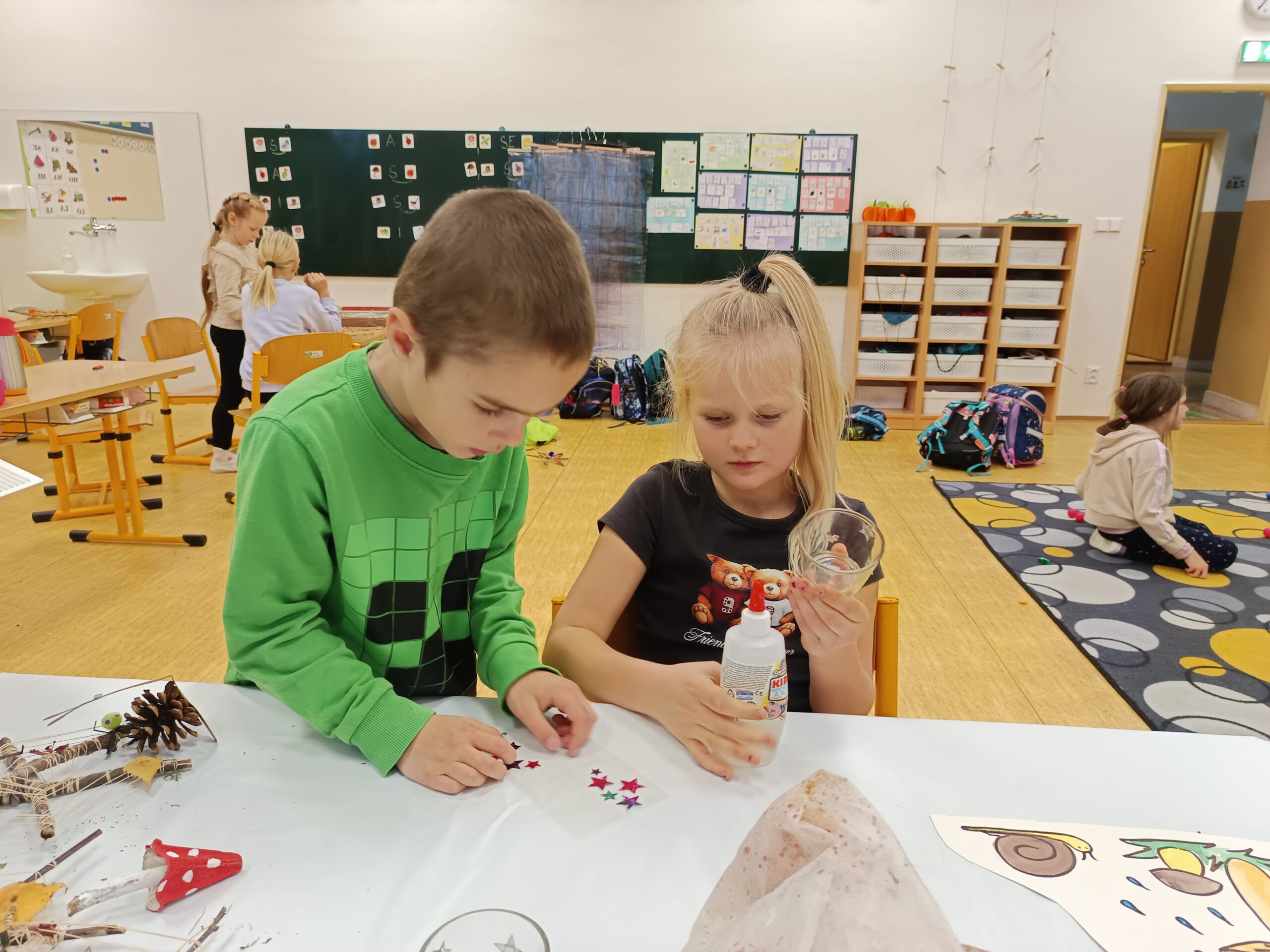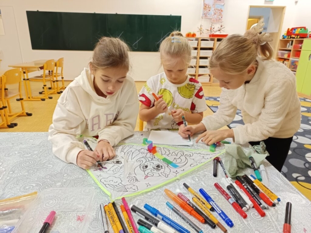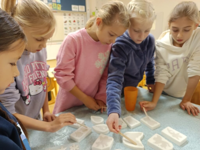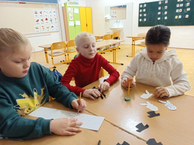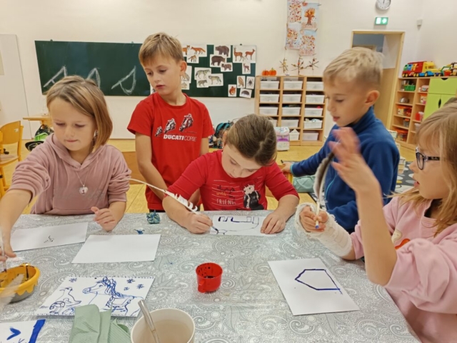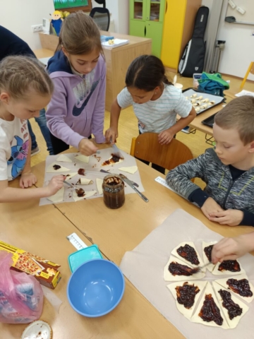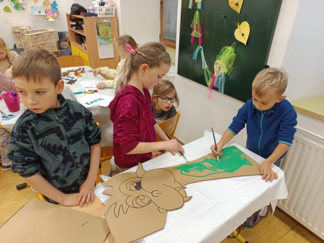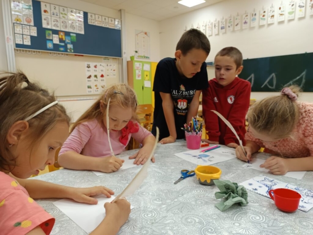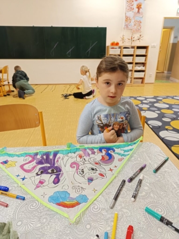 Nechybělo ani podzimní pouštění draků, které provázelo nadšení i radost z každého vzletu. V polovině měsíce jsme si připomněli svátek svatého Martina – děti pekly svatomartinské rohlíčky a vyzkoušely si psaní husím brkem, což byl pro mnohé velký zážitek. Ke konci listopadu jsme se už naladili na adventní atmosféru a začali vyrábět dekorace na připravovanou akci Adventní kavárna.
