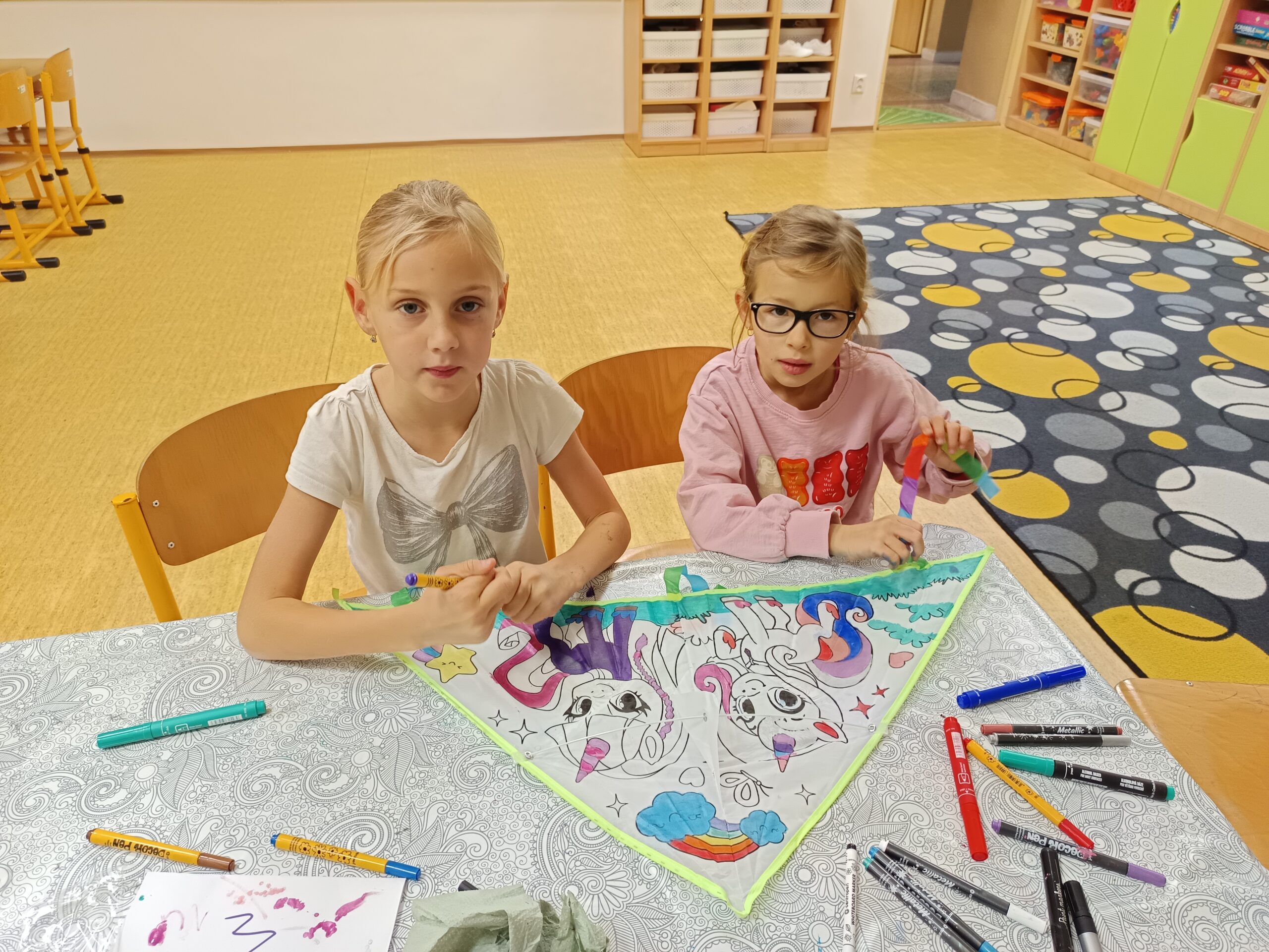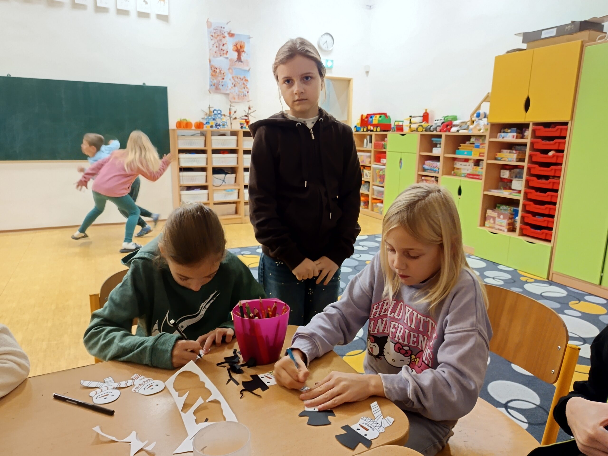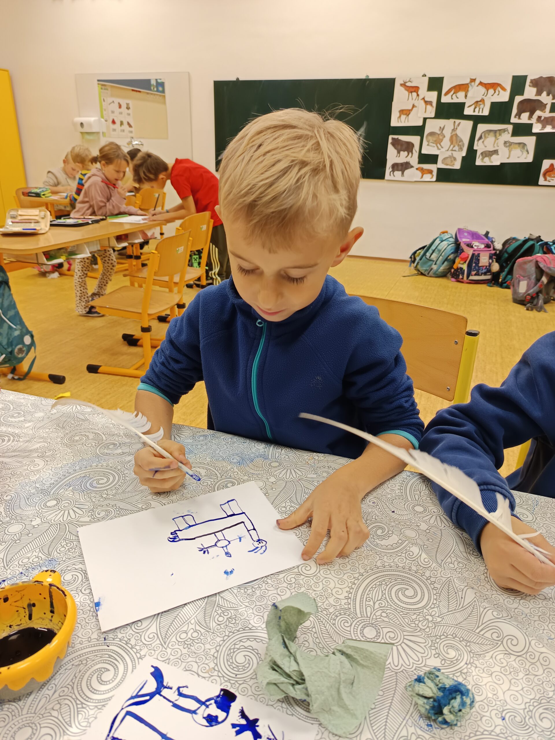 Nechybělo ani podzimní pouštění draků, které provázelo nadšení i radost z každého vzletu. V polovině měsíce jsme si připomněli svátek svatého Martina – děti pekly svatomartinské rohlíčky a vyzkoušely si psaní husím brkem, což byl pro mnohé velký zážitek. Ke konci listopadu jsme se už naladili na adventní atmosféru a začali vyrábět dekorace na připravovanou akci Adventní kavárna.