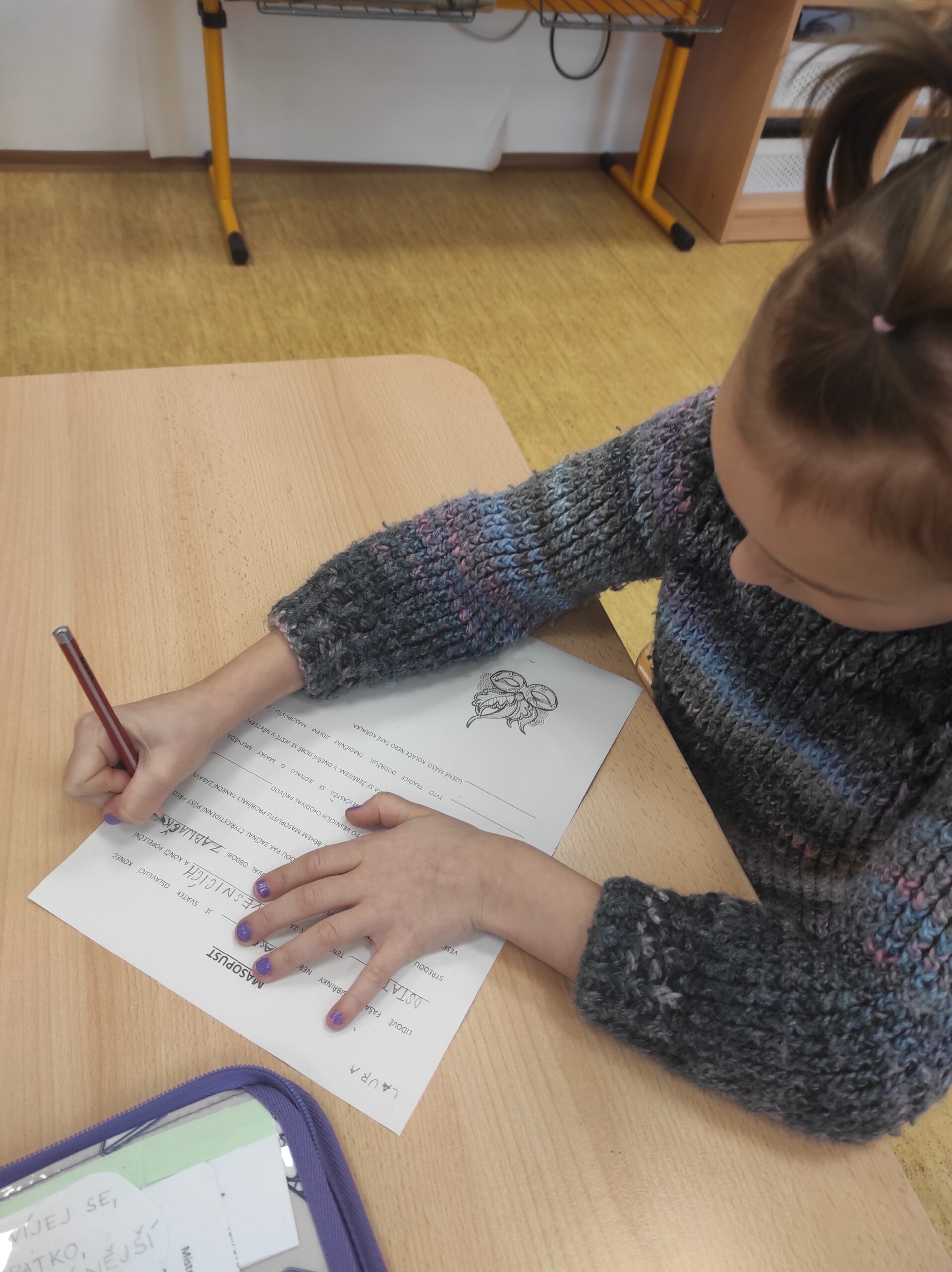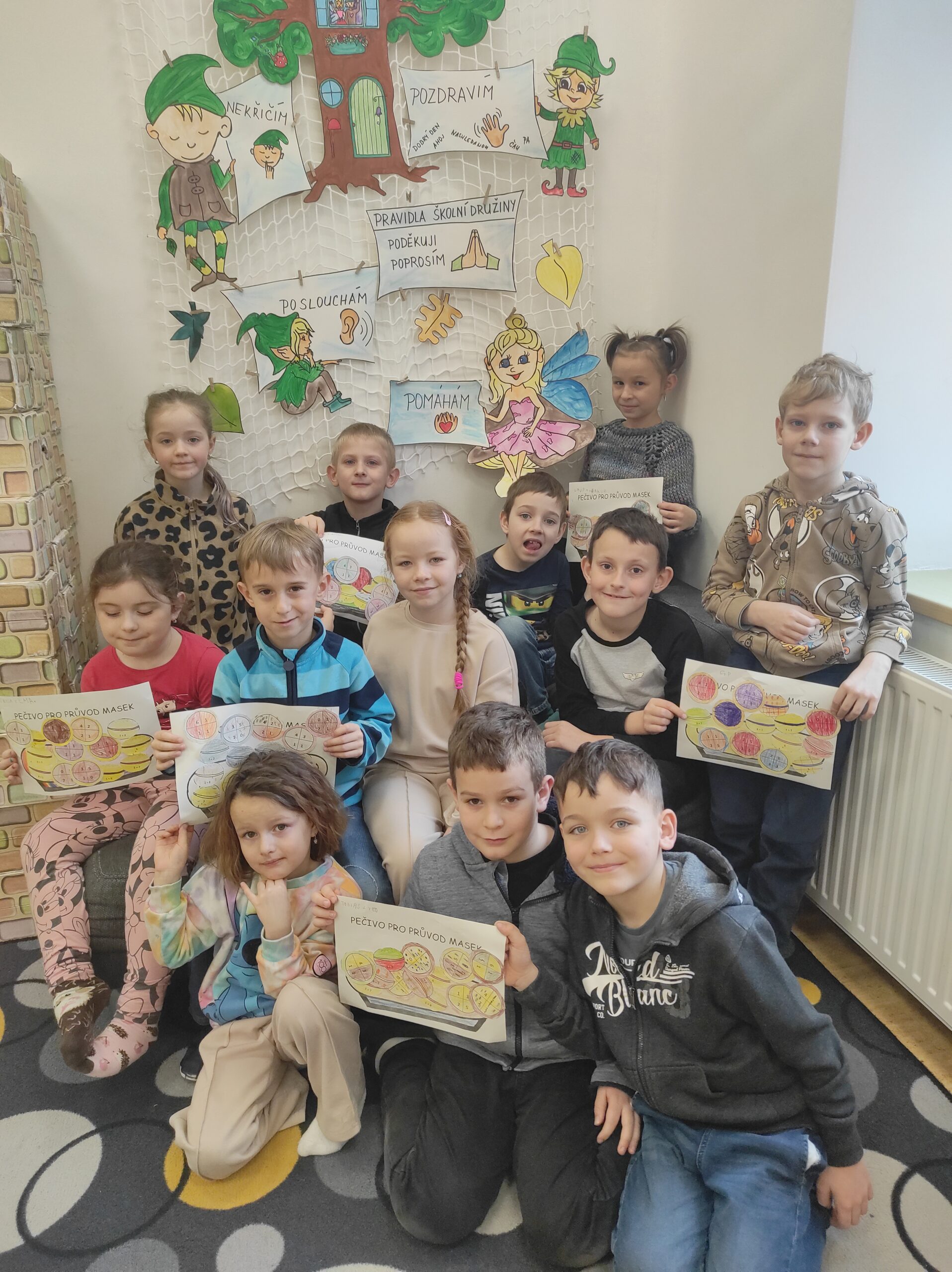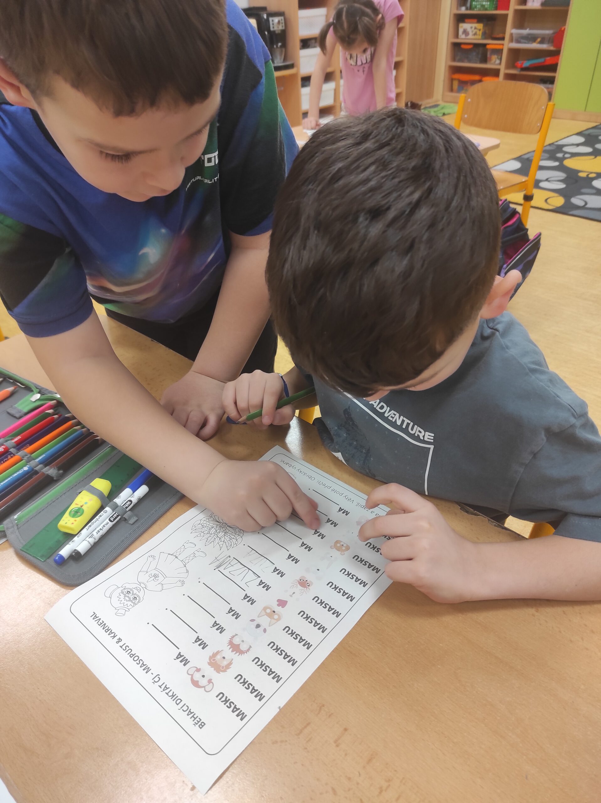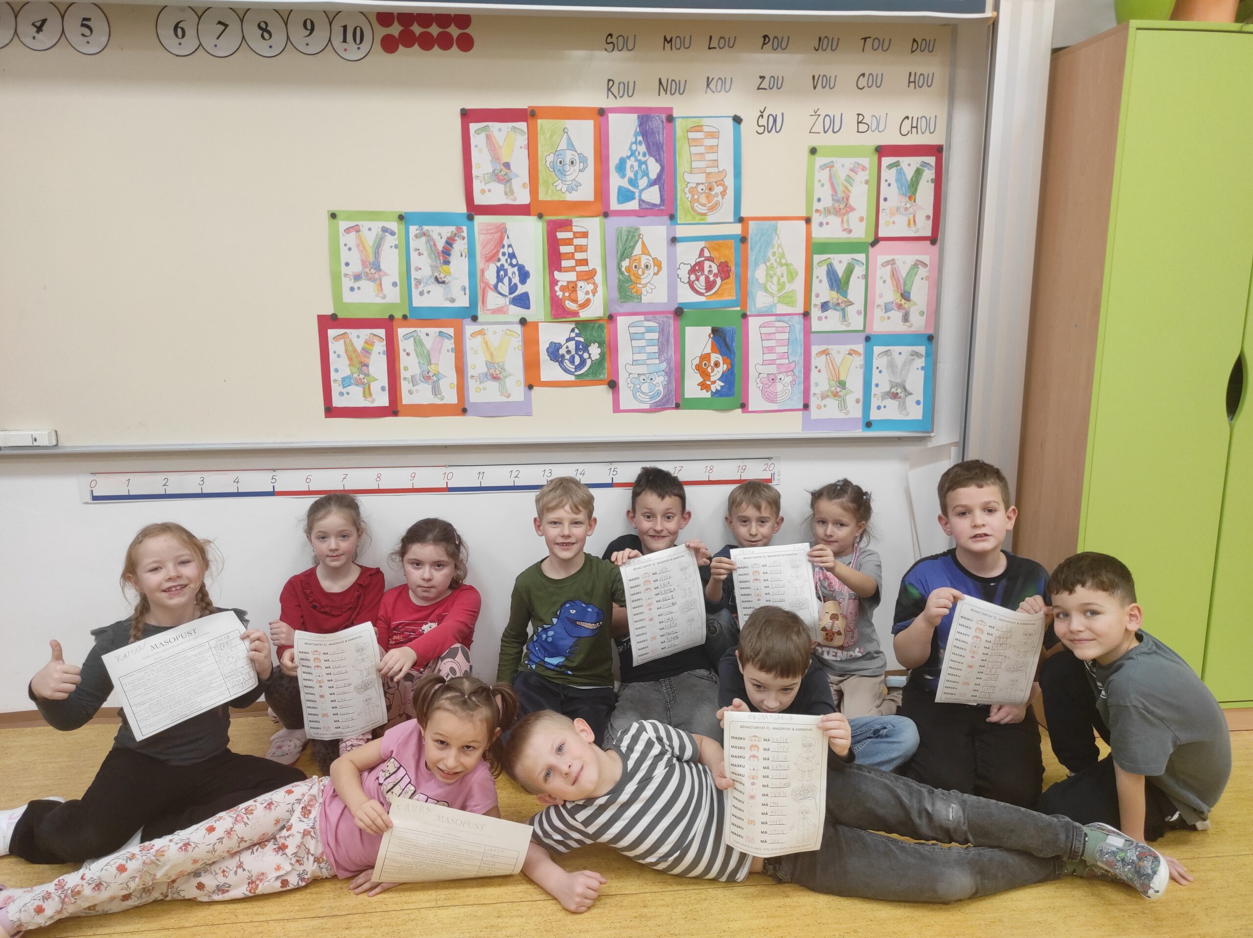 Ve třídě jsme si užili veselé fašankové chvíle plné učení i zábavy.  V matematice jsme si vyzkoušeli počítání s fašankovou tematikou a počítali příklady rozmístěné po třídě. Velký úspěch měl také běhací diktát s maskami, při kterém si žáci procvičili čtení, psaní i spolupráci. V geometrii zápasili s pravítky a snažili se co nejpřesněji spojit body, nacvičovali jsme rýsování úsečky. Zapeklitá byla výtvarka, kdy museli žáci logicky přemýšlet, aby masku vybarvili podle stanovených pravidel. Ne všichni pravidla dodrželi, ale výsledek byl nakonec hezký. Na závěr ještě hledali slova do fašankového textu. A vy víte, co jsou to ostatky – šibřinky – fašank – masopust?