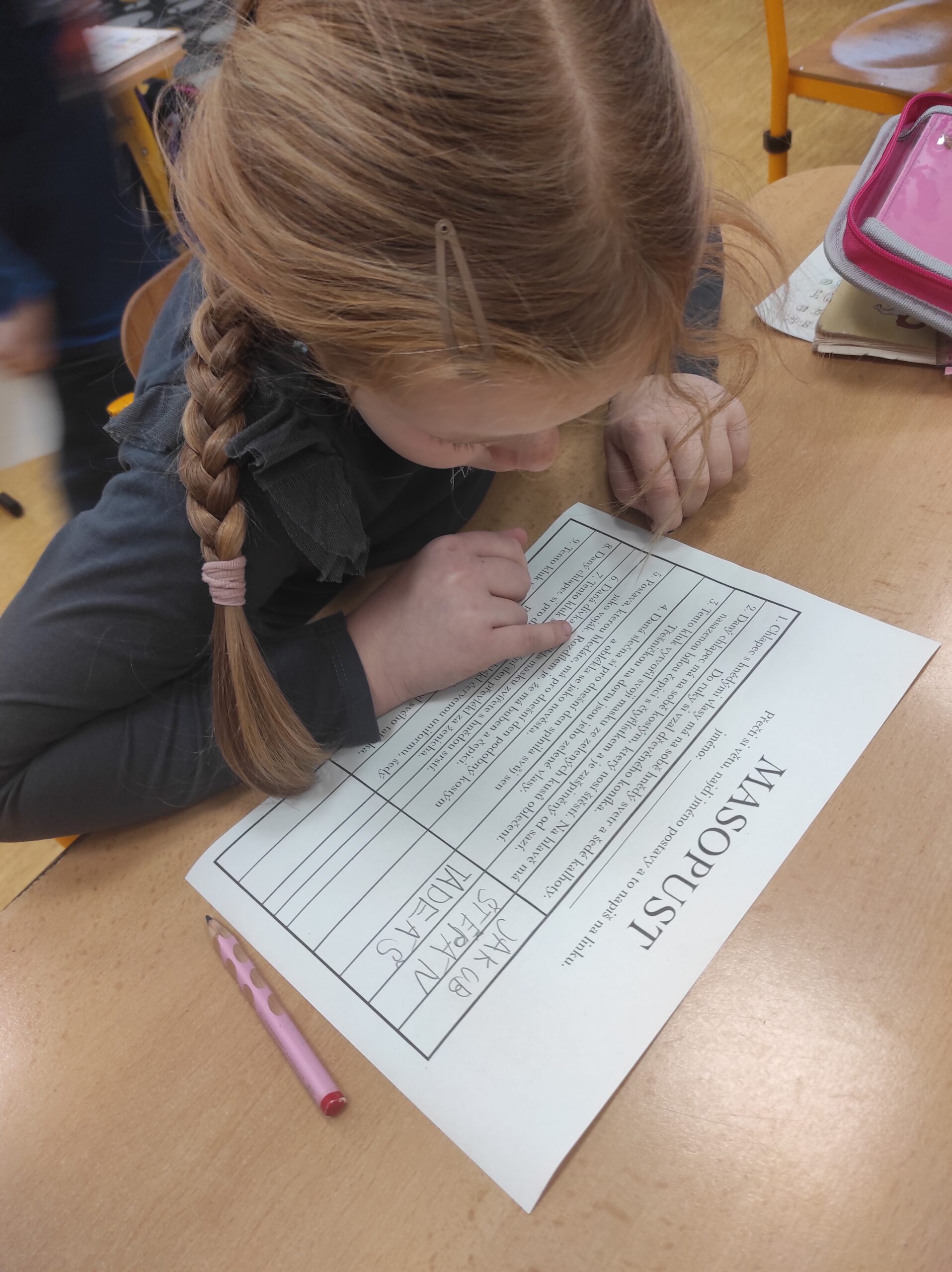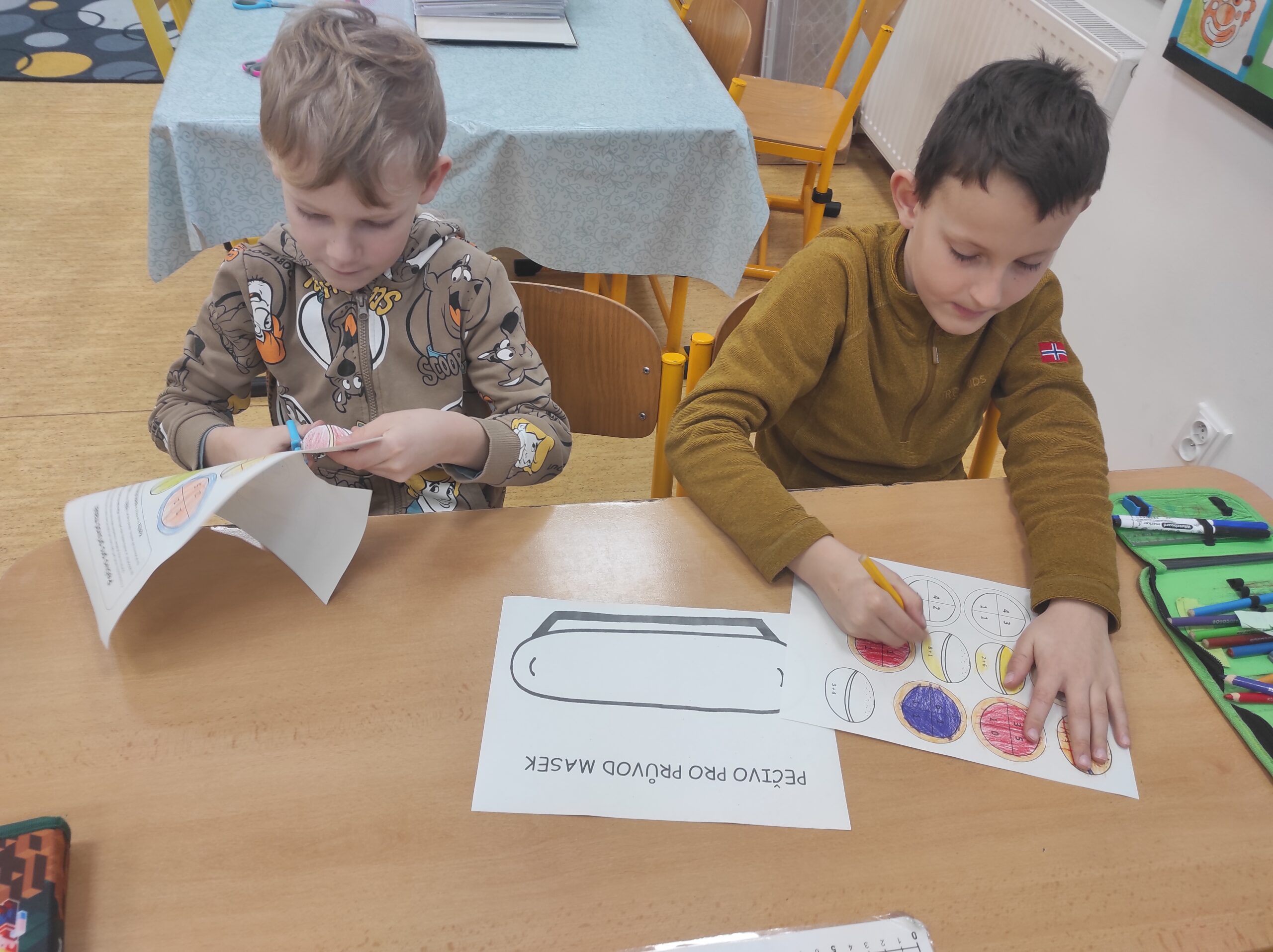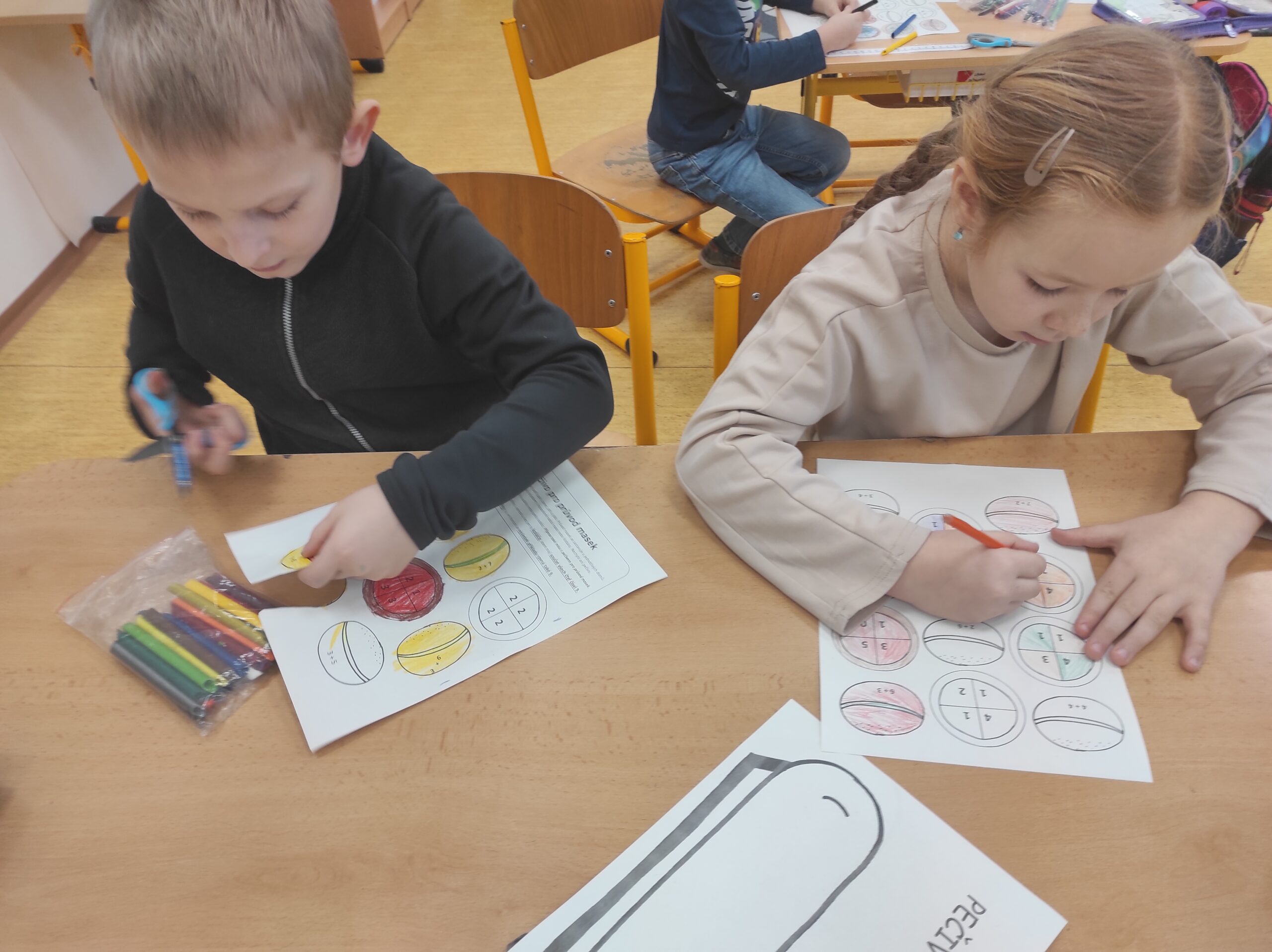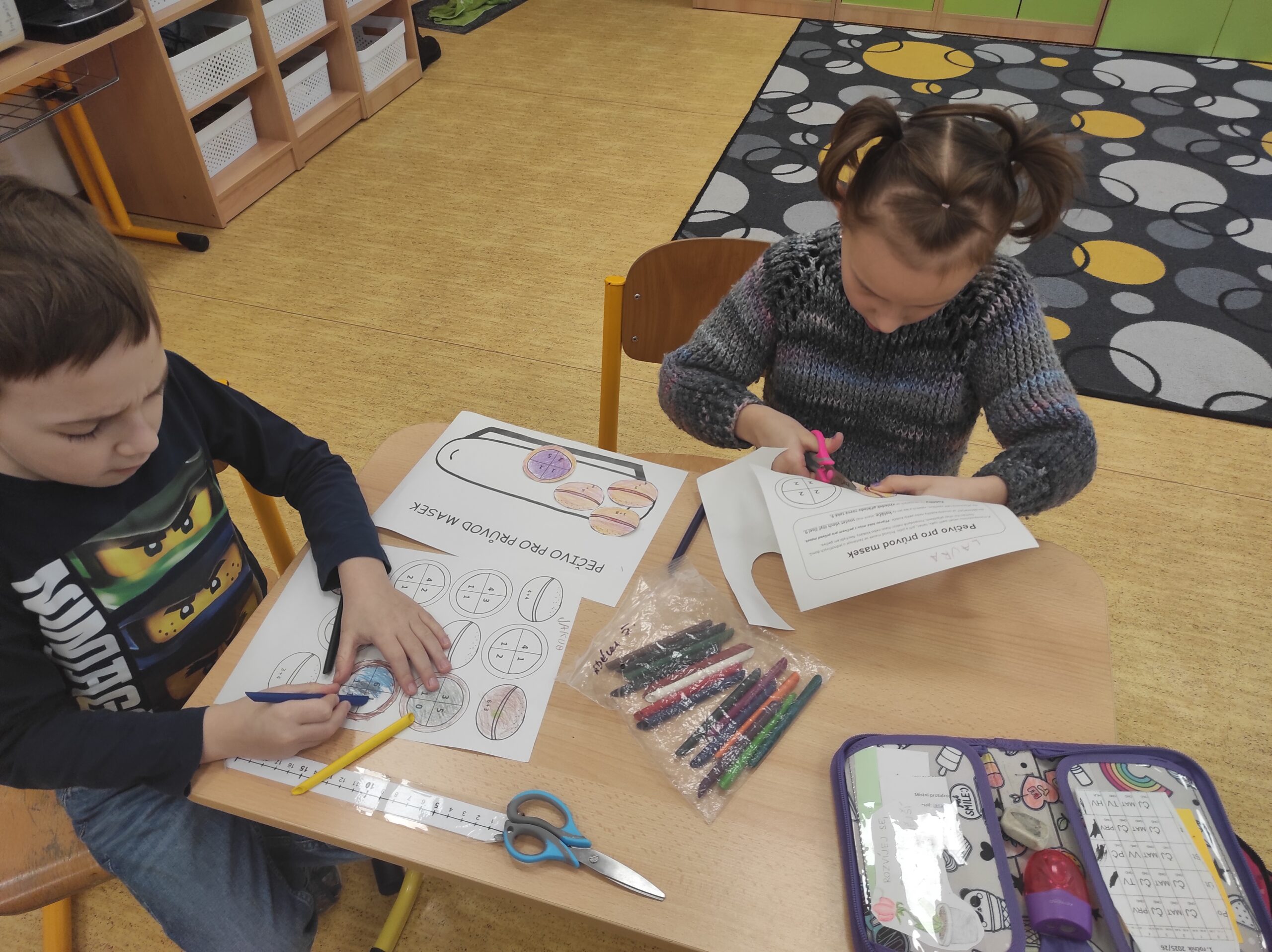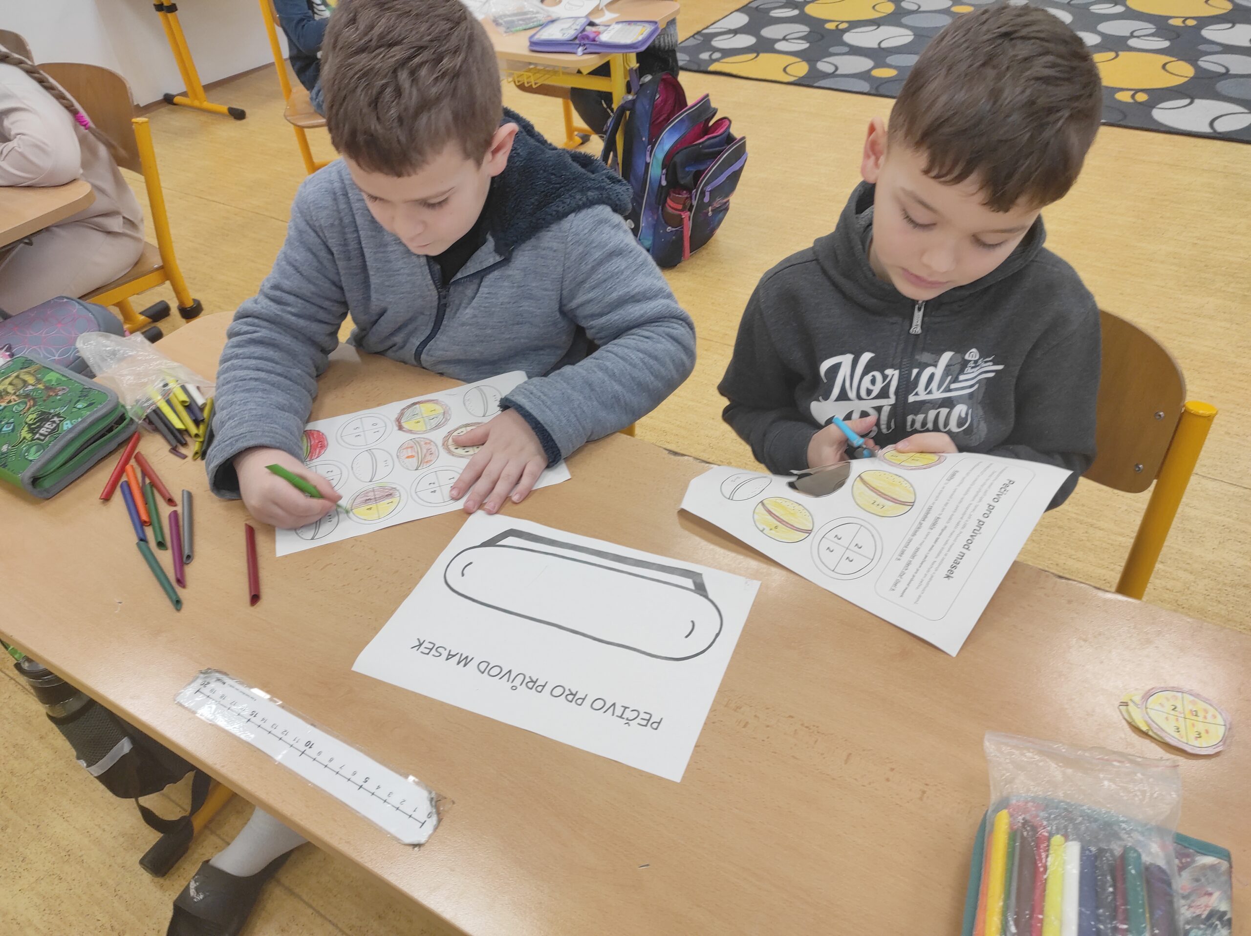 Ve třídě jsme si užili veselé fašankové chvíle plné učení i zábavy.  V matematice jsme si vyzkoušeli počítání s fašankovou tematikou a počítali příklady rozmístěné po třídě. Velký úspěch měl také běhací diktát s maskami, při kterém si žáci procvičili čtení, psaní i spolupráci. V geometrii zápasili s pravítky a snažili se co nejpřesněji spojit body, nacvičovali jsme rýsování úsečky. Zapeklitá byla výtvarka, kdy museli žáci logicky přemýšlet, aby masku vybarvili podle stanovených pravidel. Ne všichni pravidla dodrželi, ale výsledek byl nakonec hezký. Na závěr ještě hledali slova do fašankového textu. A vy víte, co jsou to ostatky – šibřinky – fašank – masopust?