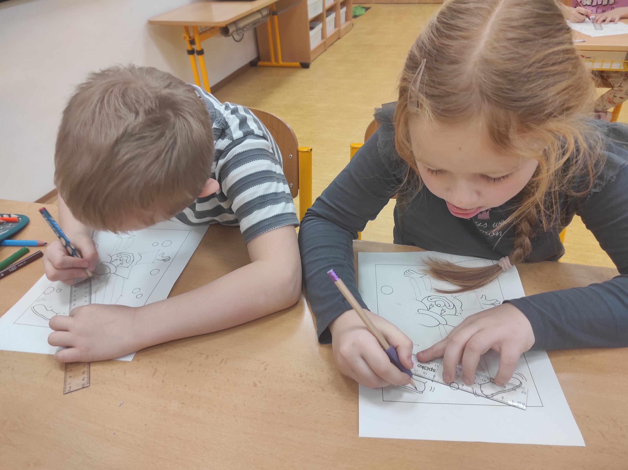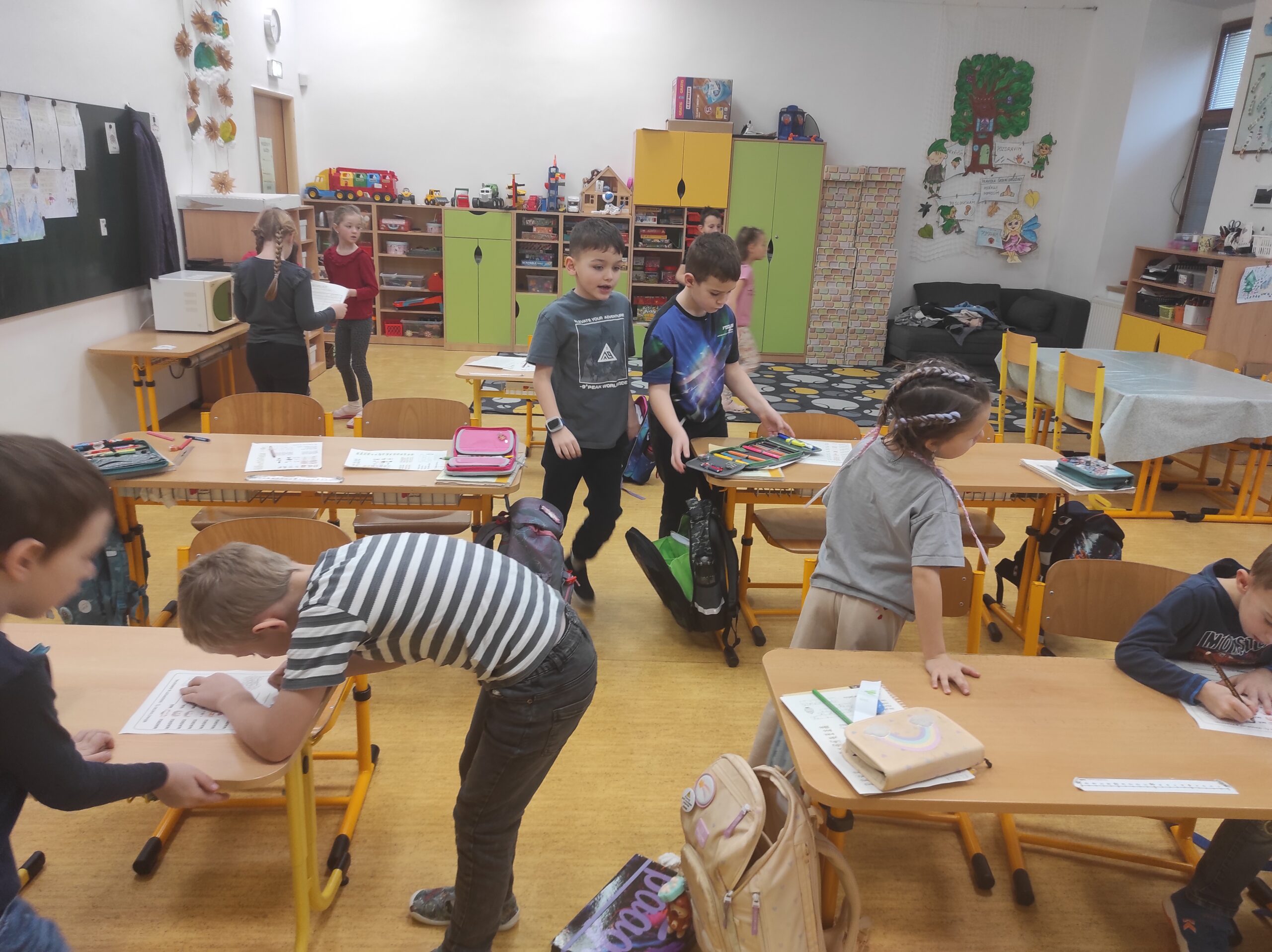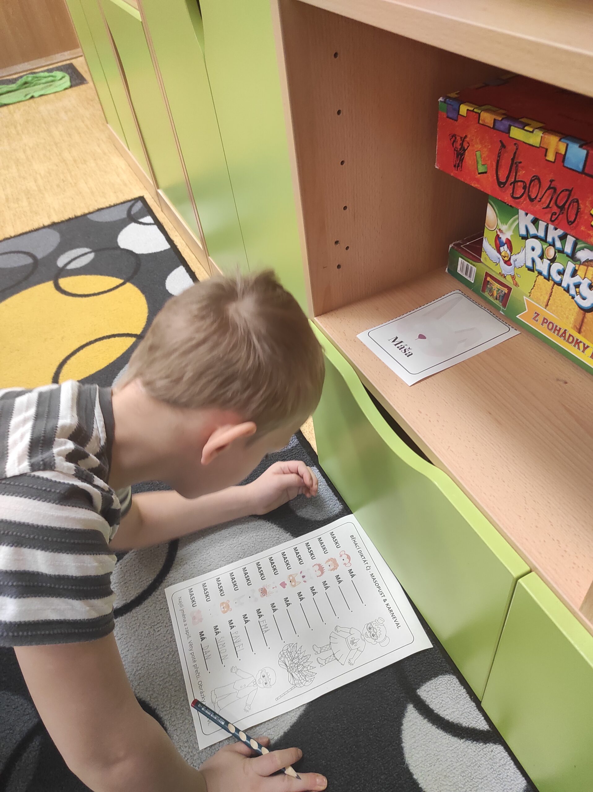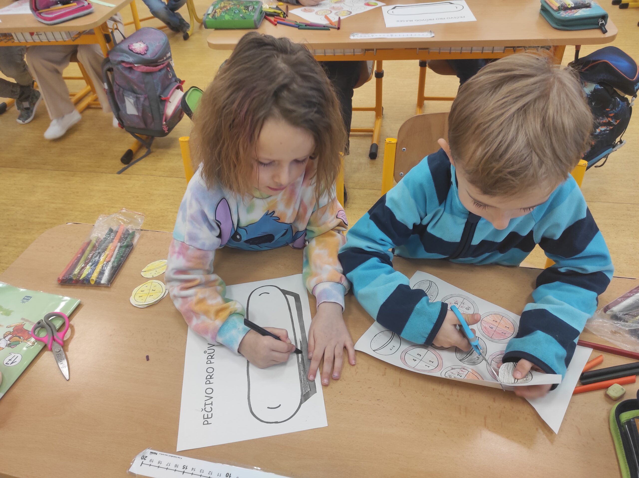 Ve třídě jsme si užili veselé fašankové chvíle plné učení i zábavy.  V matematice jsme si vyzkoušeli počítání s fašankovou tematikou a počítali příklady rozmístěné po třídě. Velký úspěch měl také běhací diktát s maskami, při kterém si žáci procvičili čtení, psaní i spolupráci. V geometrii zápasili s pravítky a snažili se co nejpřesněji spojit body, nacvičovali jsme rýsování úsečky. Zapeklitá byla výtvarka, kdy museli žáci logicky přemýšlet, aby masku vybarvili podle stanovených pravidel. Ne všichni pravidla dodrželi, ale výsledek byl nakonec hezký. Na závěr ještě hledali slova do fašankového textu. A vy víte, co jsou to ostatky – šibřinky – fašank – masopust?