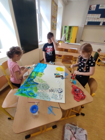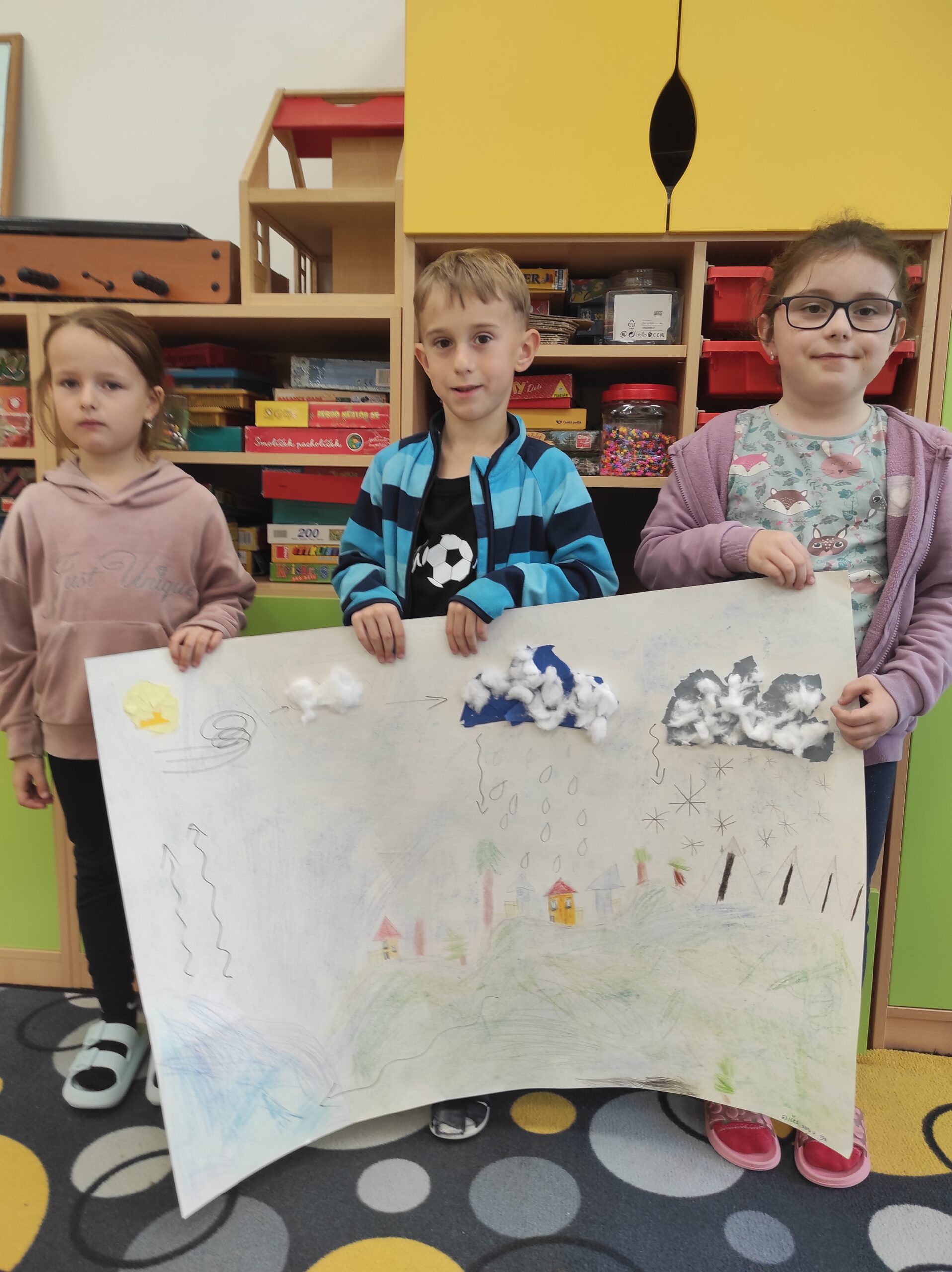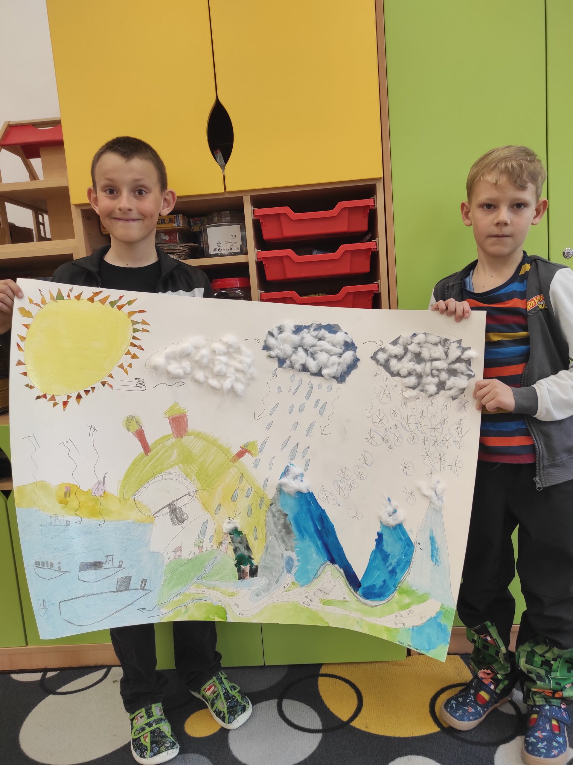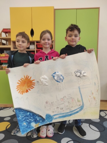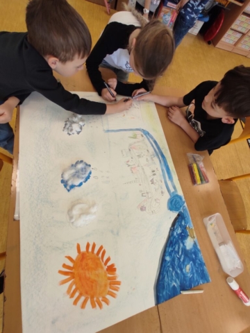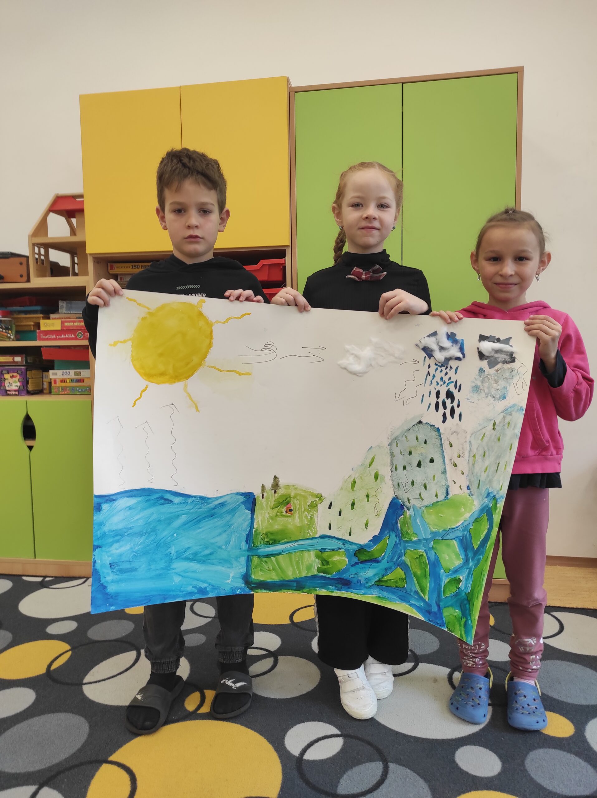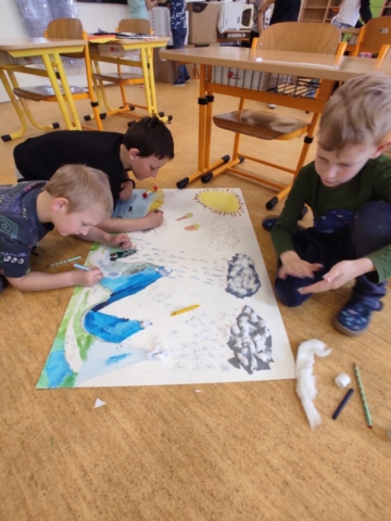 Na závěr jsme společně vytvořili plakát znázorňující koloběh vody na Zemi. Děti si tak upevnily své poznatky o tom, jak voda v přírodě neustále obíhá a proč je důležité tento přirozený proces chránit.