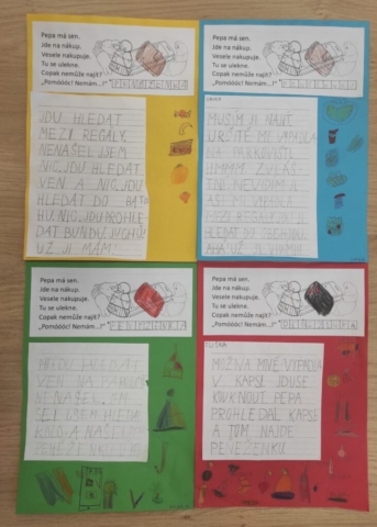 V rámci čtenářských a tvořivých aktivit jsme se pustili do dokončování příběhu o Pepovi. Děti částečně pracovaly s učebnicí Školák Pepa, kde autorka citlivě propojuje to nejlepší z různých výukových metod, a tím jsou děti více vedeny k samostatnému myšlení i tvořivosti.
