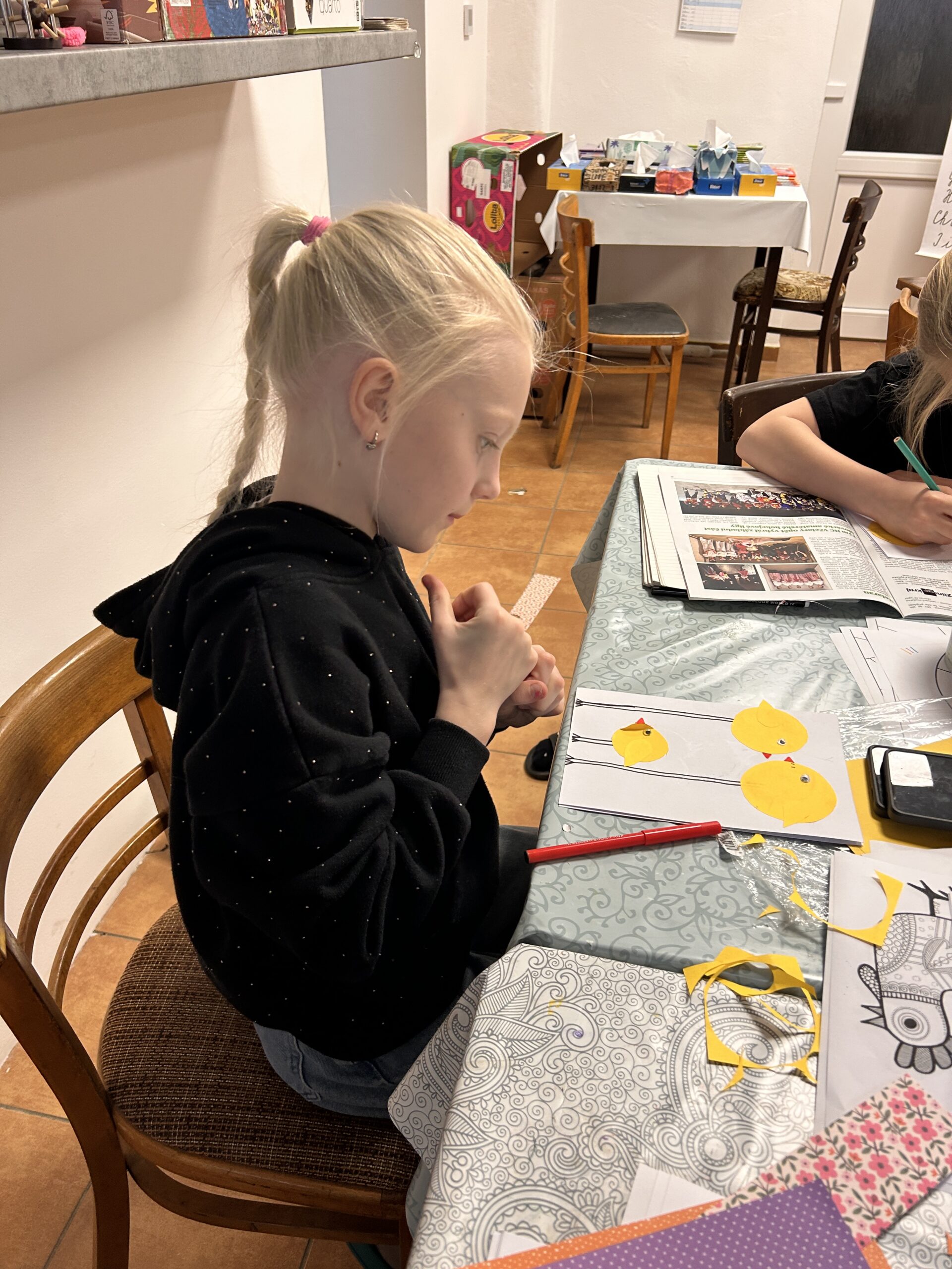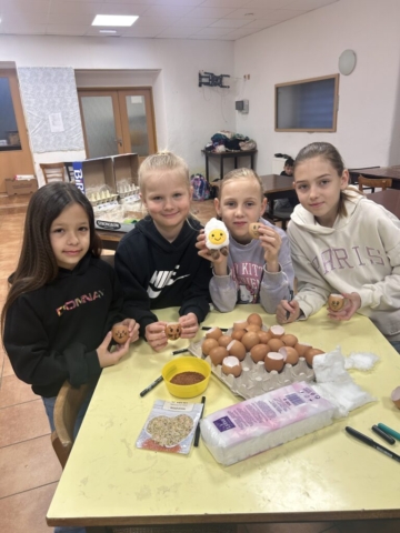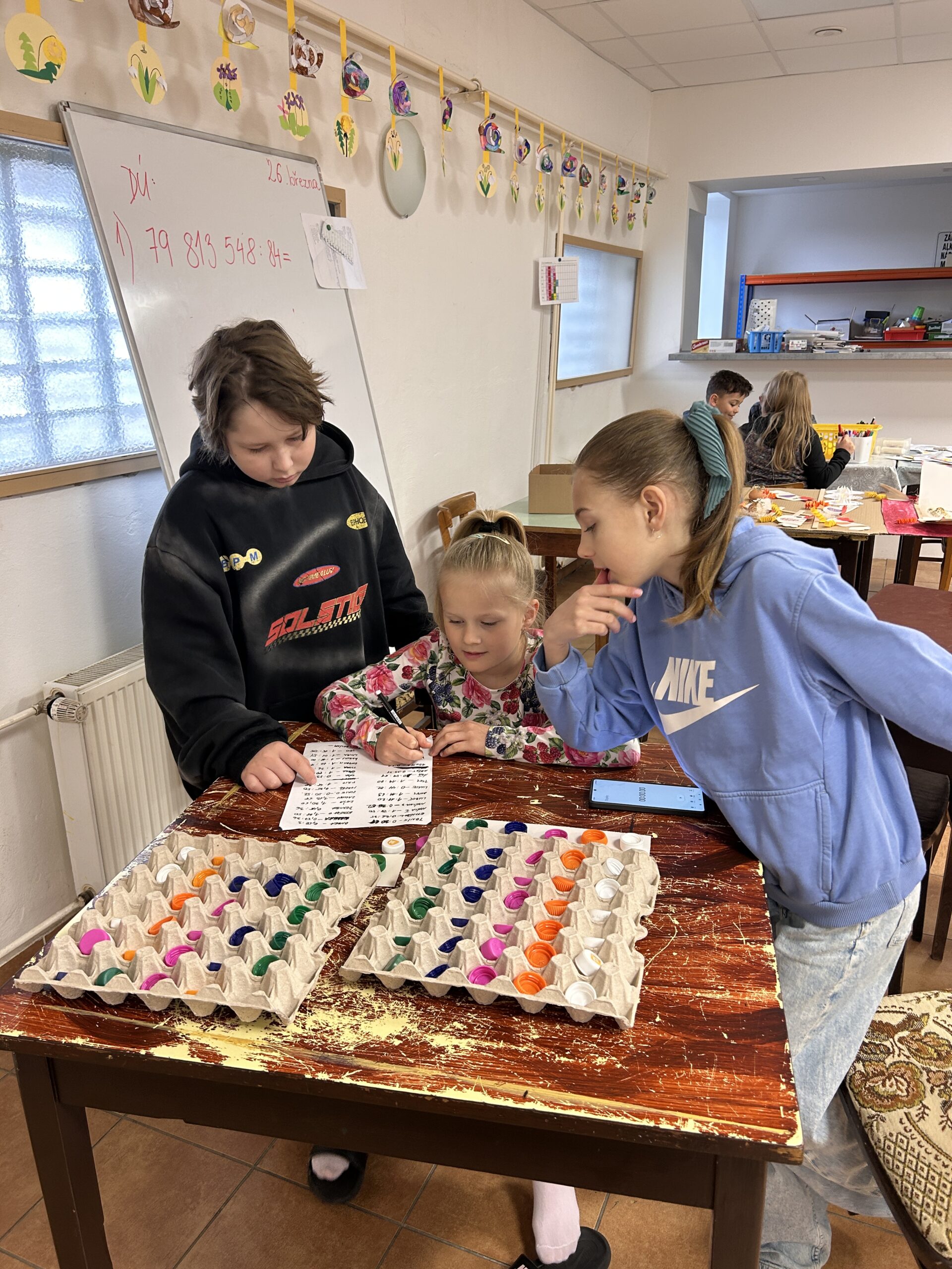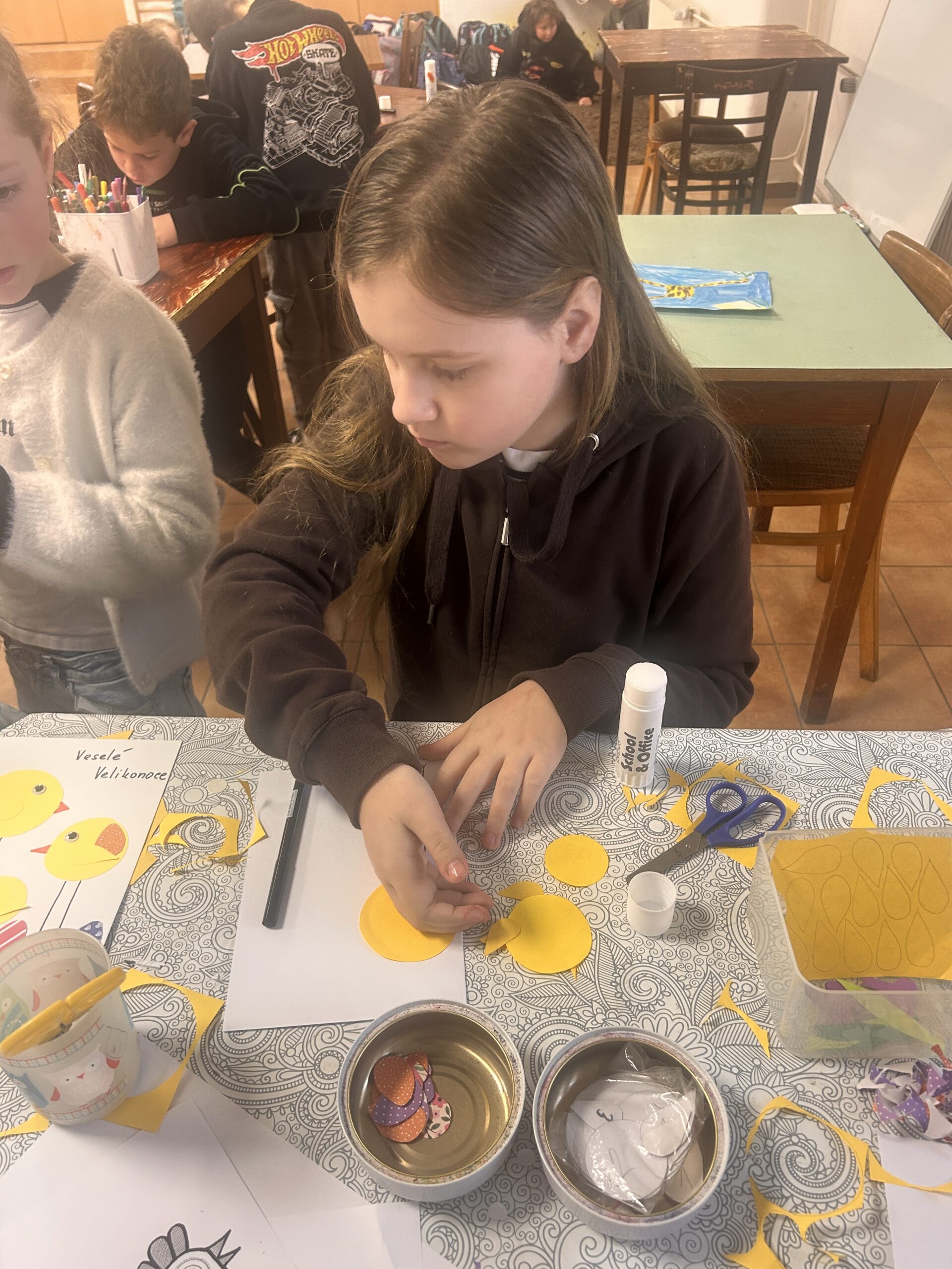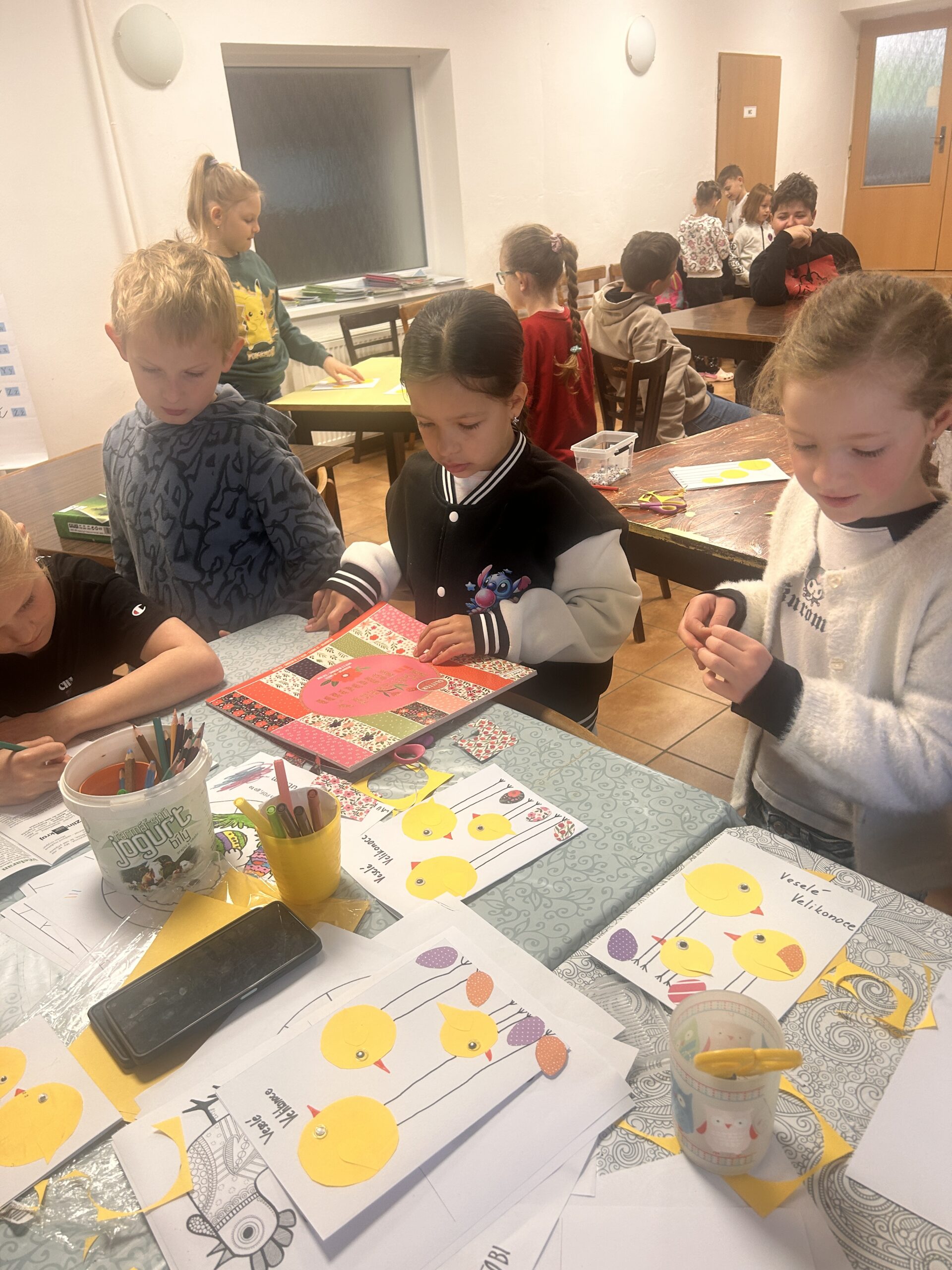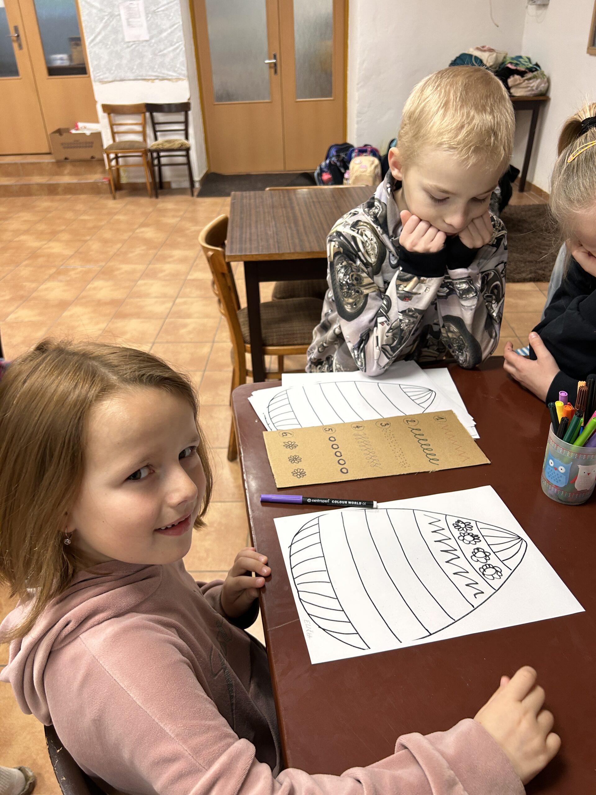 Děti se zapojily do velikonočního šifrování, luštění křížovek a osmisměrek, při kterých si přirozenou formou procvičovaly pozornost i analytické uvažování. Součástí programu bylo také třídění barevných vajíček na čas, jarní omalovánky, zdobení kraslic a další velikonoční výtvarné tvoření.